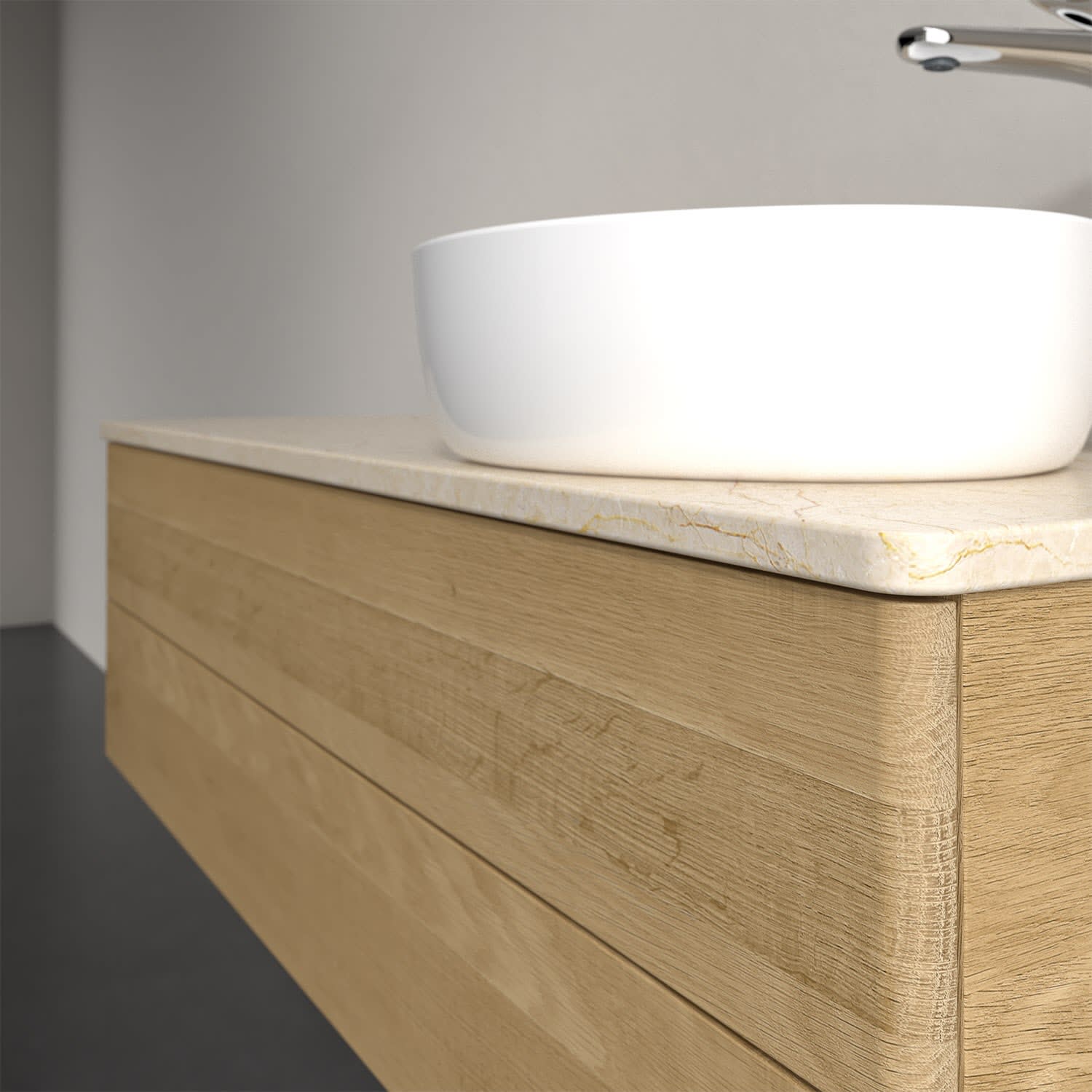 Der wandhängende Antao Waschtischunterschrank von Villeroy & Boch bietet nicht nur jede Menge Stauraum – er ist dank seines naturinspirierten Designs mit seinen abgerundeten Kanten auch noch besonders stilvoll und schafft eine gemütliche Atmosphäre im Badezimmer. Auf der Waschtischplatte bietet sich seitlich des Waschtischs viel Platz für Zahnbürstenbecher oder Seifenspender. Zwei geräumige Auszüge bieten viel Platz, um alles Notwendige zu verstauen und Ordnung zu halten. Öffnen lassen sie sich durch leichten Druck auf die grifflose Front. Dank Vollauszug hat man immer alles im Blick und der Antirutschboden verhindert ein Umfallen oder Verrutschen der Gegenstände. Einfach clever! Für eine besonders leichte Pflege sorgt die mehrschichtig deckend lackierte Oberfläche. Bei der Ausführung in Massivholz wird dank des verarbeiteten Massivholzes jedes Möbel zu einem Unikat, das sich durch das lebendige Naturmaterial durch seine einzigartige Struktur und Maserung auszeichnet.