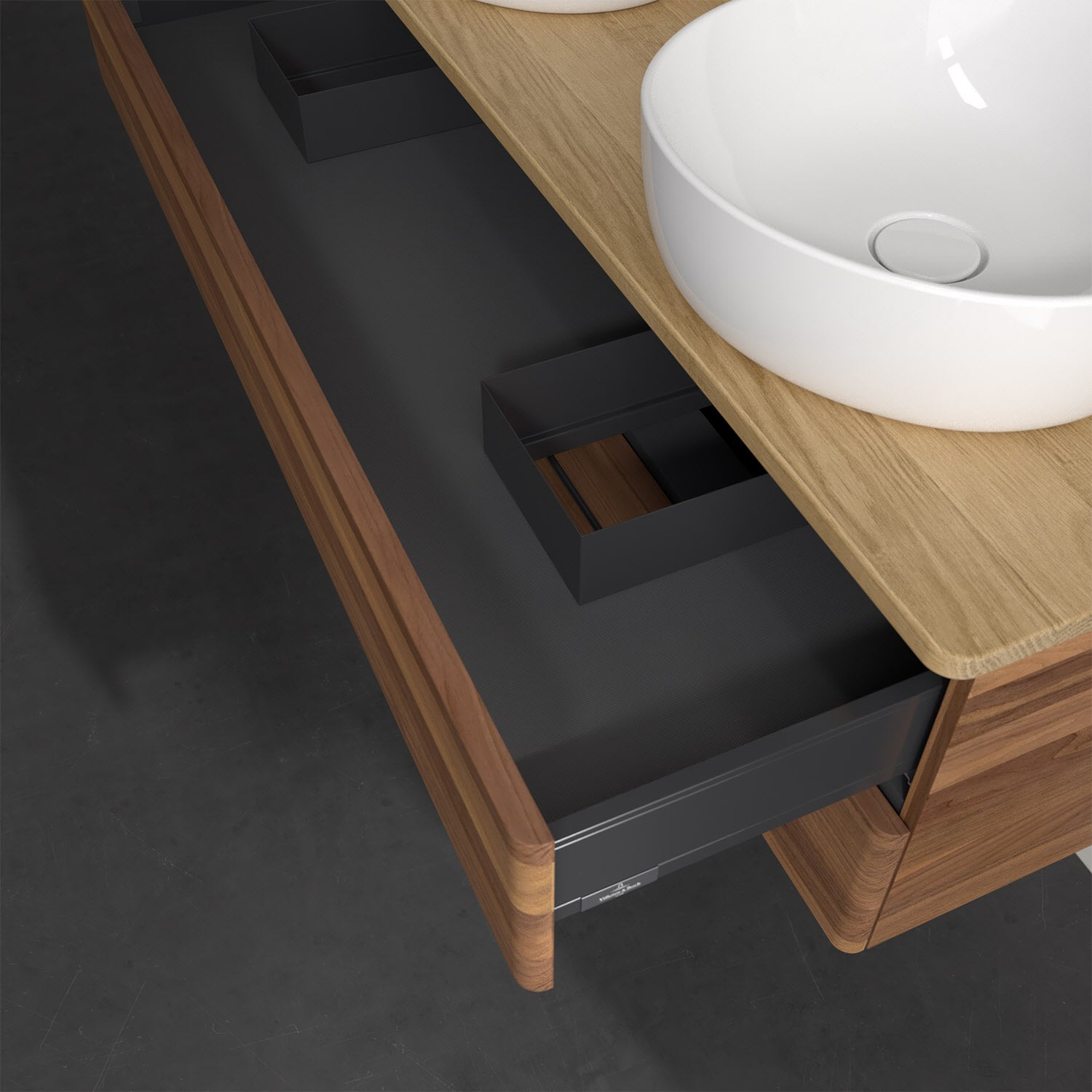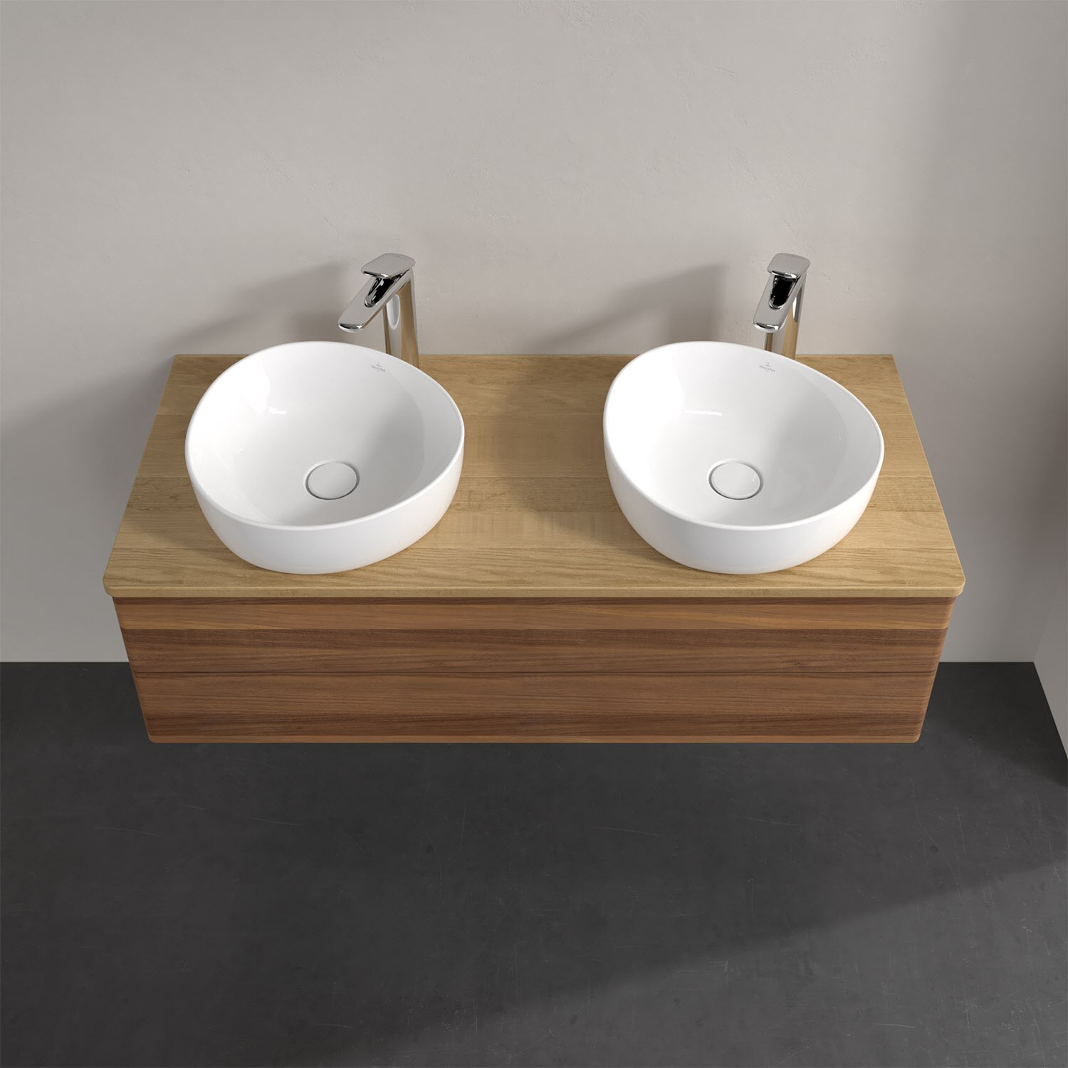 Der wandhängende Antao Waschtischunterschrank von Villeroy & Boch bietet nicht nur jede Menge Stauraum – er ist dank seines naturinspirierten Designs mit seinen abgerundeten Kanten auch noch besonders stilvoll und schafft eine gemütliche Atmosphäre im Badezimmer. Kombiniert mit zwei passenden Aufsatzwaschtischen also die ideale Wahl. Zwei geräumige Auszüge bieten viel Platz, um alles Notwendige zu verstauen und Ordnung zu halten. Öffnen lassen sie sich durch leichten Druck auf die grifflose Front. Dank Vollauszug hat man immer alles im Blick und der Antirutschboden verhindert ein Umfallen oder Verrutschen der Gegenstände. Einfach clever! Für eine besonders leichte Pflege sorgt die mehrschichtig deckend lackierte Oberfläche. Bei der Ausführung in Massivholz wird dank des verarbeiteten Massivholzes jedes Möbel zu einem Unikat, das sich durch das lebendige Naturmaterial durch seine einzigartige Struktur und Maserung auszeichnet.