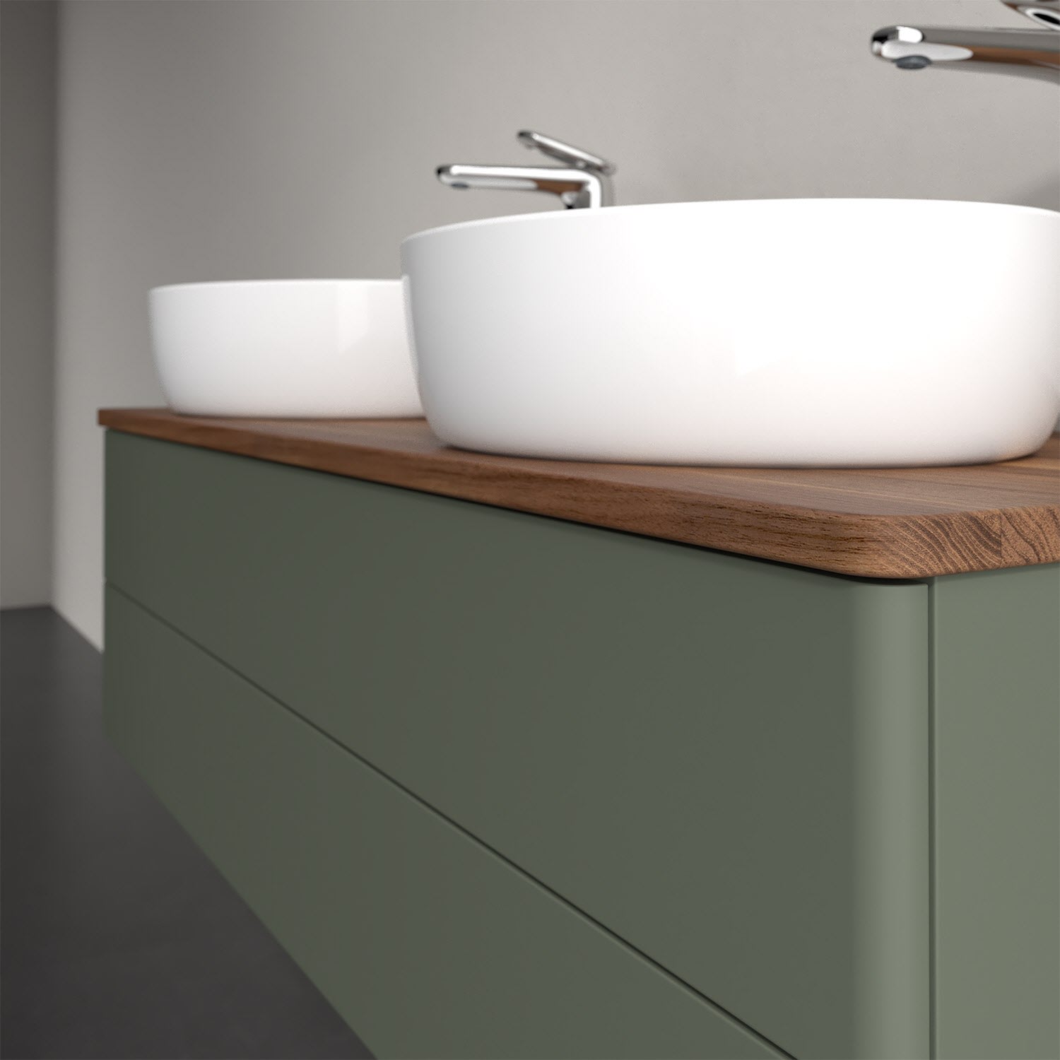 Der wandhängende Antao Waschtischunterschrank von Villeroy & Boch bietet nicht nur jede Menge Stauraum – er ist dank seines naturinspirierten Designs mit seinen abgerundeten Kanten auch noch besonders stilvoll und schafft eine gemütliche Atmosphäre im Badezimmer. Kombiniert mit zwei passenden Aufsatzwaschtischen also die ideale Wahl. Zwei geräumige Auszüge bieten viel Platz, um alles Notwendige zu verstauen und Ordnung zu halten. Öffnen lassen sie sich durch leichten Druck auf die grifflose Front. Dank Vollauszug hat man immer alles im Blick und der Antirutschboden verhindert ein Umfallen oder Verrutschen der Gegenstände. Einfach clever! Für eine besonders leichte Pflege sorgt die mehrschichtig deckend lackierte Oberfläche. Bei der Ausführung in Massivholz wird dank des verarbeiteten Massivholzes jedes Möbel zu einem Unikat, das sich durch das lebendige Naturmaterial durch seine einzigartige Struktur und Maserung auszeichnet.