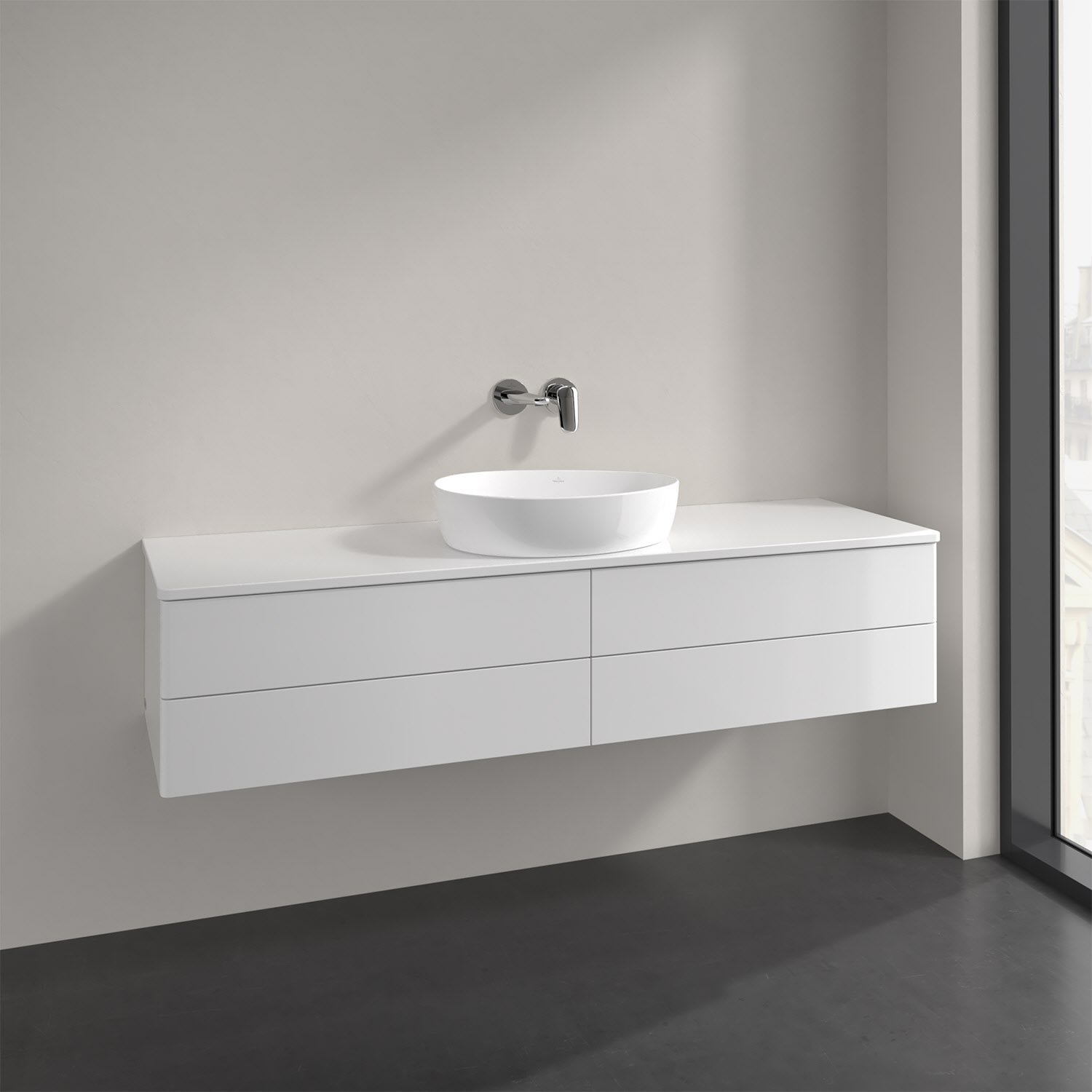 Der wandhängende Antao Waschtischunterschrank bietet mit seinen vier Auszügen und seiner erstaunlichen Größe viel Platz zum Verstauen von Utensilien im Badezimmer. Dank des mittig platzierten Aufsatzwaschtischs gibt es seitlich weiteren Platz für Handtücher, Seifenspender & Co. auf der Waschtischplatte. Inspiriert von der Natur überzeugt der Unterschrank auch optisch mit sanfter Formsprache und abgerundete Kanten. Die grifflosen Auszüge sind mit der Push-to-Open Funktion ausgestattet und verfügen über einen Antirutschboden, damit Utensilien sicher verstaut werden können. Mit seiner Vollauszug- und Selbsteinzug-Funktion ist der Schrank praktisch und leicht zu bedienen. Qualität von Villeroy & Boch! Für eine besonders leichte Pflege sorgt die mehrschichtig deckend lackierte Oberfläche.
