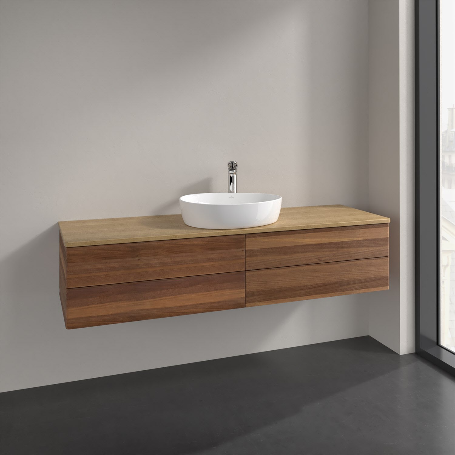 Der wandhängende Antao Waschtischunterschrank bietet mit seinen vier Auszügen und seiner erstaunlichen Größe viel Platz zum Verstauen von Utensilien im Badezimmer. Dank des mittig platzierten Aufsatzwaschtischs gibt es seitlich weiteren Platz für Handtücher, Seifenspender & Co. auf der Waschtischplatte. Inspiriert von der Natur überzeugt der Unterschrank auch optisch mit sanfter Formsprache und abgerundete Kanten. Die grifflosen Auszüge sind mit der Push-to-Open Funktion ausgestattet und verfügen über einen Antirutschboden, damit Utensilien sicher verstaut werden können. Mit seiner Vollauszug- und Selbsteinzug-Funktion ist der Schrank praktisch und leicht zu bedienen. Qualität von Villeroy & Boch! Für eine besonders leichte Pflege sorgt die mehrschichtig deckend lackierte Oberfläche. Bei der Ausführung in Massivholz wird dank des verarbeiteten Massivholzes jedes Möbel zu einem Unikat, das sich durch das lebendige Naturmaterial durch seine einzigartige Struktur und Maserung auszeichnet.