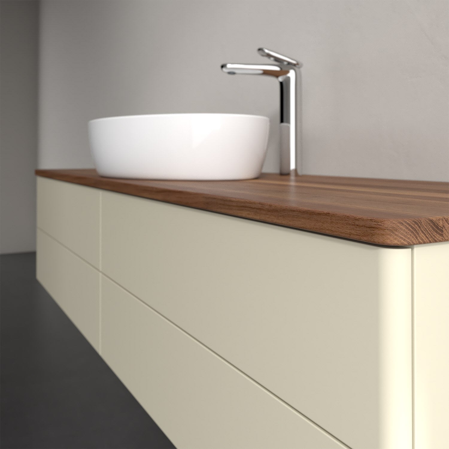 Für diesen Waschbeckenunterschrank stehen Ihnen Aufsatzwaschtische aus verschiedenen Serien zur Verfügung (siehe "Passliste" unter Downloads). Ein ausgewähltes Beispiel finden Sie im Zubehör. Den Waschtisch bitte separat mitbestellen.
