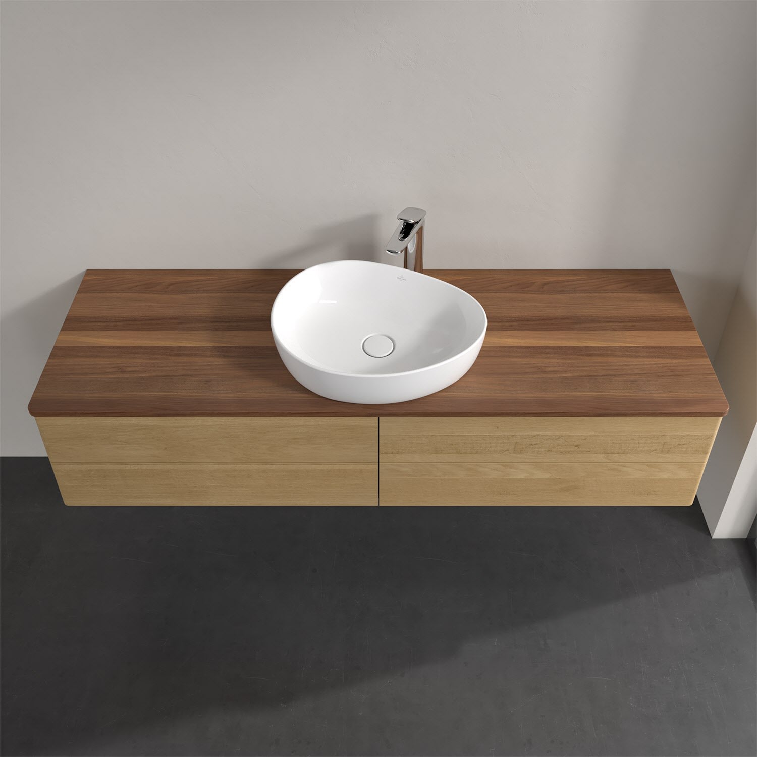 Der wandhängende Antao Waschtischunterschrank bietet mit seinen vier Auszügen und seiner erstaunlichen Größe viel Platz zum Verstauen von Utensilien im Badezimmer. Dank des mittig platzierten Aufsatzwaschtischs gibt es seitlich weiteren Platz für Handtücher, Seifenspender & Co. auf der Waschtischplatte. Inspiriert von der Natur überzeugt der Unterschrank auch optisch mit sanfter Formsprache und abgerundete Kanten. Die grifflosen Auszüge sind mit der Push-to-Open Funktion ausgestattet und verfügen über einen Antirutschboden, damit Utensilien sicher verstaut werden können. Mit seiner Vollauszug- und Selbsteinzug-Funktion ist der Schrank praktisch und leicht zu bedienen. Qualität von Villeroy & Boch! Für eine besonders leichte Pflege sorgt die mehrschichtig deckend lackierte Oberfläche. Bei der Ausführung in Massivholz wird dank des verarbeiteten Massivholzes jedes Möbel zu einem Unikat, das sich durch das lebendige Naturmaterial durch seine einzigartige Struktur und Maserung auszeichnet.