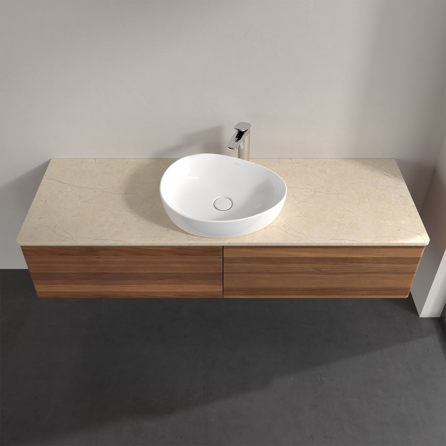 Für diesen Waschbeckenunterschrank stehen Ihnen Aufsatzwaschtische aus verschiedenen Serien zur Verfügung (siehe "Passliste" unter Downloads). Ein ausgewähltes Beispiel finden Sie im Zubehör. Den Waschtisch bitte separat mitbestellen.