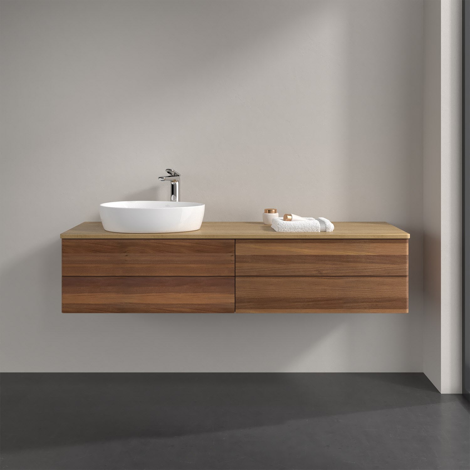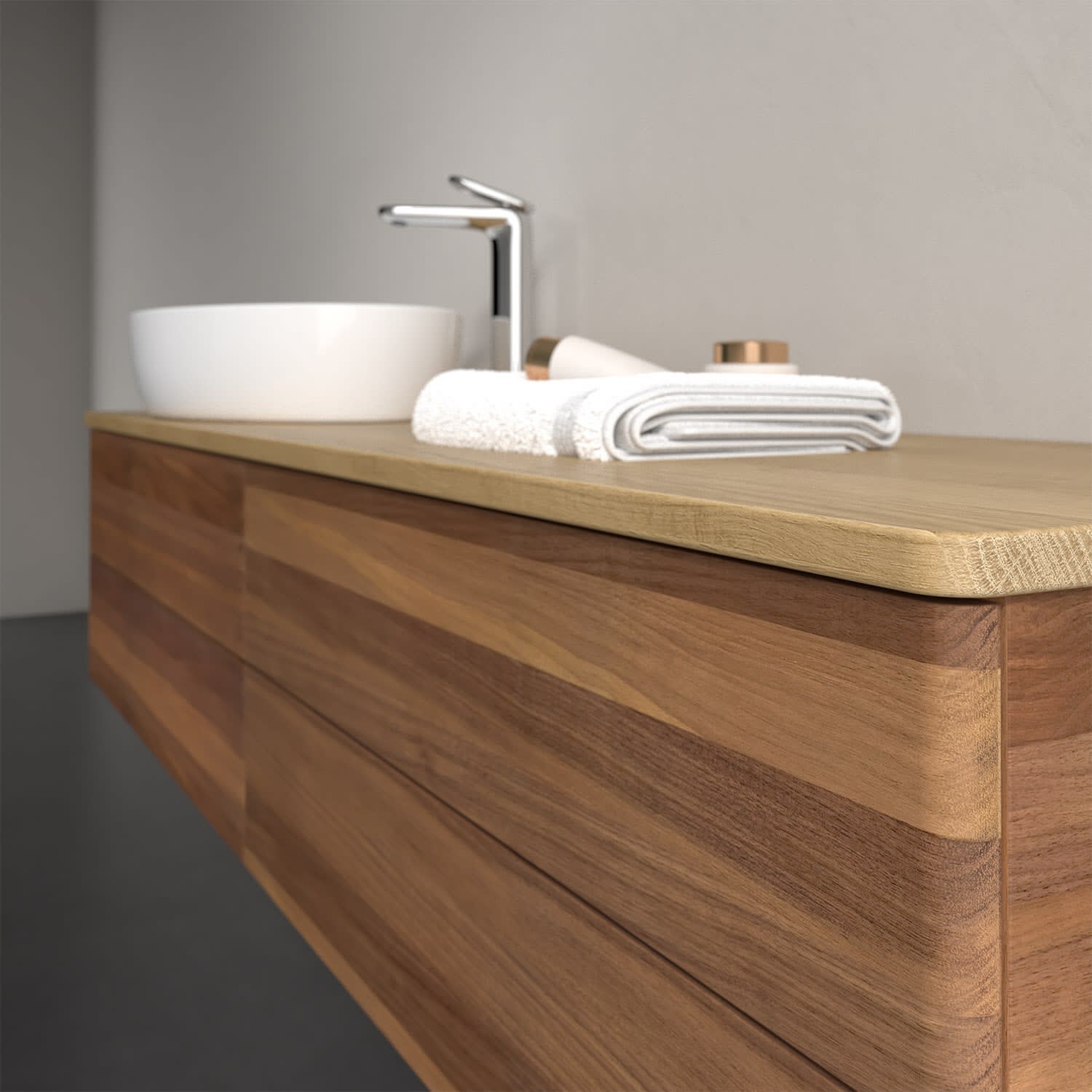 Der wandhängende Antao Waschtischunterschrank bietet mit seinen vier Auszügen und seiner erstaunlichen Größe viel Platz zum Verstauen von Utensilien im Badezimmer. Dank des seitlich platzierten Aufsatzwaschtischs gibt es daneben weiteren Platz für Handtücher, Seifenspender & Co. auf der Waschtischplatte. Inspiriert von der Natur überzeugt der Unterschrank auch optisch mit sanfter Formsprache und abgerundete Kanten. Die grifflosen Auszüge sind mit der Push-to-Open Funktion ausgestattet und verfügen über einen Antirutschboden, damit Utensilien sicher verstaut werden können. Mit seiner Vollauszug- und Selbsteinzug-Funktion ist der Schrank praktisch und leicht zu bedienen. Qualität von Villeroy & Boch! Für eine besonders leichte Pflege sorgt die mehrschichtig deckend lackierte Oberfläche. Bei der Ausführung in Massivholz wird dank des verarbeiteten Massivholzes jedes Möbel zu einem Unikat, das sich durch das lebendige Naturmaterial durch seine einzigartige Struktur und Maserung auszeichnet.