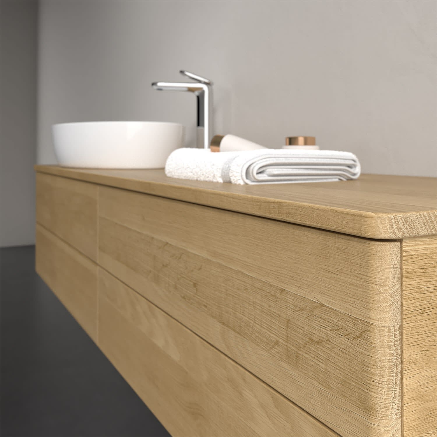 Der wandhängende Antao Waschtischunterschrank bietet mit seinen vier Auszügen und seiner erstaunlichen Größe viel Platz zum Verstauen von Utensilien im Badezimmer. Dank des seitlich platzierten Aufsatzwaschtischs gibt es daneben weiteren Platz für Handtücher, Seifenspender & Co. auf der Waschtischplatte. Inspiriert von der Natur überzeugt der Unterschrank auch optisch mit sanfter Formsprache und abgerundete Kanten. Die grifflosen Auszüge sind mit der Push-to-Open Funktion ausgestattet und verfügen über einen Antirutschboden, damit Utensilien sicher verstaut werden können. Mit seiner Vollauszug- und Selbsteinzug-Funktion ist der Schrank praktisch und leicht zu bedienen. Qualität von Villeroy & Boch! Für eine besonders leichte Pflege sorgt die mehrschichtig deckend lackierte Oberfläche. Bei der Ausführung in Massivholz wird dank des verarbeiteten Massivholzes jedes Möbel zu einem Unikat, das sich durch das lebendige Naturmaterial durch seine einzigartige Struktur und Maserung auszeichnet.