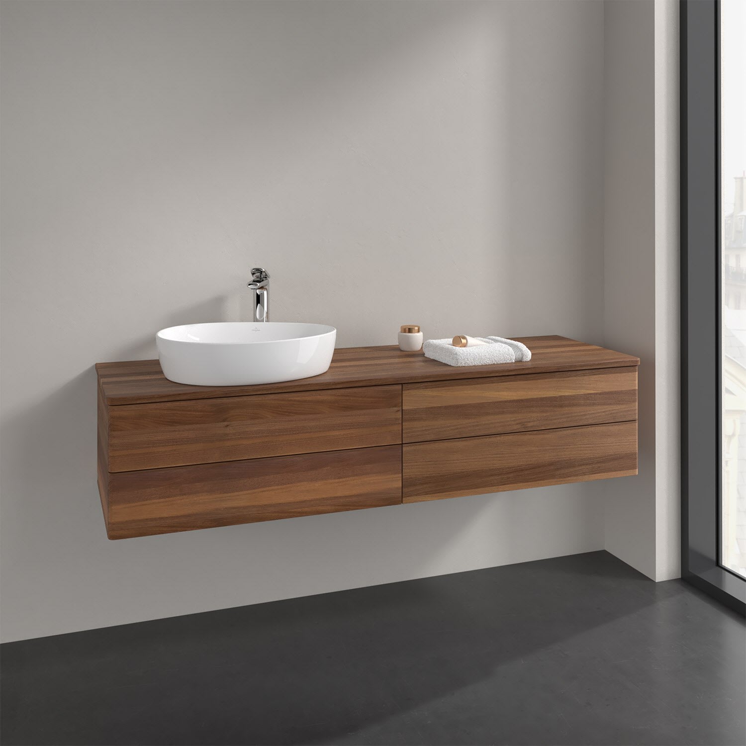 Der wandhängende Antao Waschtischunterschrank bietet mit seinen vier Auszügen und seiner erstaunlichen Größe viel Platz zum Verstauen von Utensilien im Badezimmer. Dank des seitlich platzierten Aufsatzwaschtischs gibt es daneben weiteren Platz für Handtücher, Seifenspender & Co. auf der Waschtischplatte. Inspiriert von der Natur überzeugt der Unterschrank auch optisch mit sanfter Formsprache und abgerundete Kanten. Die grifflosen Auszüge sind mit der Push-to-Open Funktion ausgestattet und verfügen über einen Antirutschboden, damit Utensilien sicher verstaut werden können. Mit seiner Vollauszug- und Selbsteinzug-Funktion ist der Schrank praktisch und leicht zu bedienen. Qualität von Villeroy & Boch! Für eine besonders leichte Pflege sorgt die mehrschichtig deckend lackierte Oberfläche. Bei der Ausführung in Massivholz wird dank des verarbeiteten Massivholzes jedes Möbel zu einem Unikat, das sich durch das lebendige Naturmaterial durch seine einzigartige Struktur und Maserung auszeichnet.