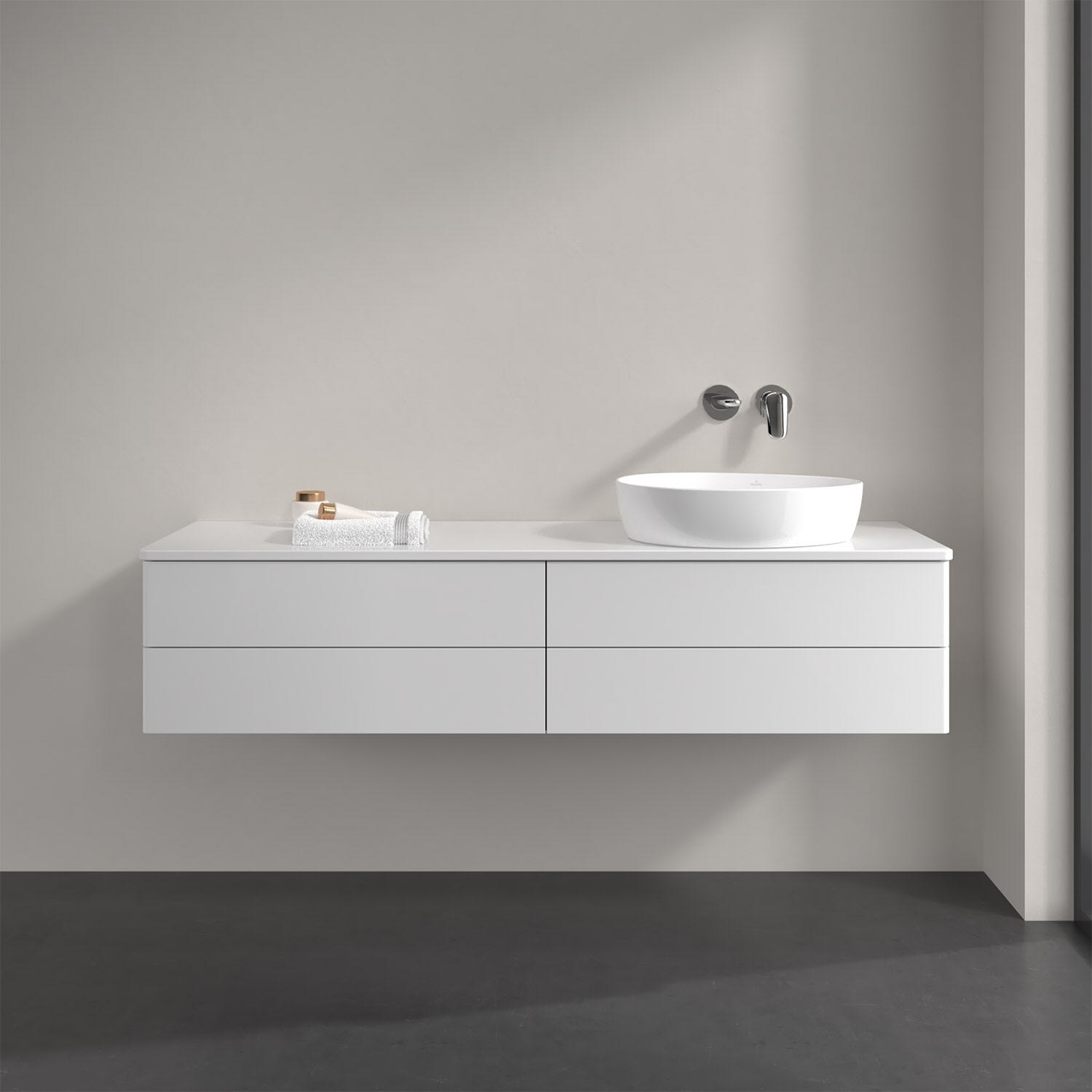 Der wandhängende Antao Waschtischunterschrank bietet mit seinen vier Auszügen und seiner erstaunlichen Größe viel Platz zum Verstauen von Utensilien im Badezimmer. Dank des seitlich platzierten Aufsatzwaschtischs gibt es daneben weiteren Platz für Handtücher, Seifenspender & Co. auf der Waschtischplatte. Inspiriert von der Natur überzeugt der Unterschrank auch optisch mit sanfter Formsprache und abgerundete Kanten. Die grifflosen Auszüge sind mit der Push-to-Open Funktion ausgestattet und verfügen über einen Antirutschboden, damit Utensilien sicher verstaut werden können. Mit seiner Vollauszug- und Selbsteinzug-Funktion ist der Schrank praktisch und leicht zu bedienen. Qualität von Villeroy & Boch! Für eine besonders leichte Pflege sorgt die mehrschichtig deckend lackierte Oberfläche.