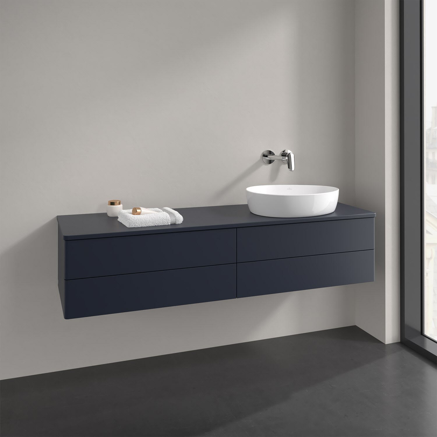 Der wandhängende Antao Waschtischunterschrank bietet mit seinen vier Auszügen und seiner erstaunlichen Größe viel Platz zum Verstauen von Utensilien im Badezimmer. Dank des seitlich platzierten Aufsatzwaschtischs gibt es daneben weiteren Platz für Handtücher, Seifenspender & Co. auf der Waschtischplatte. Inspiriert von der Natur überzeugt der Unterschrank auch optisch mit sanfter Formsprache und abgerundete Kanten. Die grifflosen Auszüge sind mit der Push-to-Open Funktion ausgestattet und verfügen über einen Antirutschboden, damit Utensilien sicher verstaut werden können. Mit seiner Vollauszug- und Selbsteinzug-Funktion ist der Schrank praktisch und leicht zu bedienen. Qualität von Villeroy & Boch! Für eine besonders leichte Pflege sorgt die mehrschichtig deckend lackierte Oberfläche.