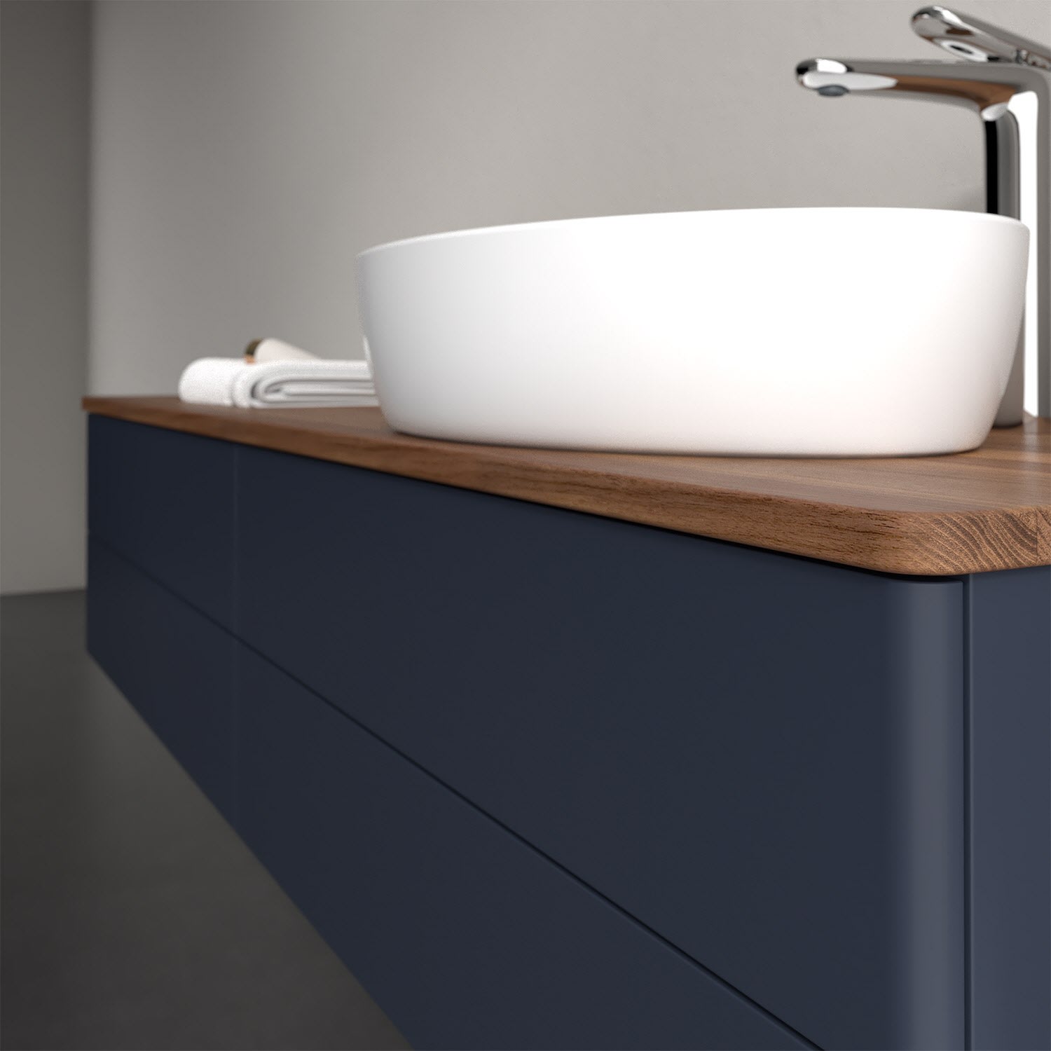 Der wandhängende Antao Waschtischunterschrank bietet mit seinen vier Auszügen und seiner erstaunlichen Größe viel Platz zum Verstauen von Utensilien im Badezimmer. Dank des seitlich platzierten Aufsatzwaschtischs gibt es daneben weiteren Platz für Handtücher, Seifenspender & Co. auf der Waschtischplatte. Inspiriert von der Natur überzeugt der Unterschrank auch optisch mit sanfter Formsprache und abgerundete Kanten. Die grifflosen Auszüge sind mit der Push-to-Open Funktion ausgestattet und verfügen über einen Antirutschboden, damit Utensilien sicher verstaut werden können. Mit seiner Vollauszug- und Selbsteinzug-Funktion ist der Schrank praktisch und leicht zu bedienen. Qualität von Villeroy & Boch! Für eine besonders leichte Pflege sorgt die mehrschichtig deckend lackierte Oberfläche. Bei der Ausführung in Massivholz wird dank des verarbeiteten Massivholzes jedes Möbel zu einem Unikat, das sich durch das lebendige Naturmaterial durch seine einzigartige Struktur und Maserung auszeichnet.