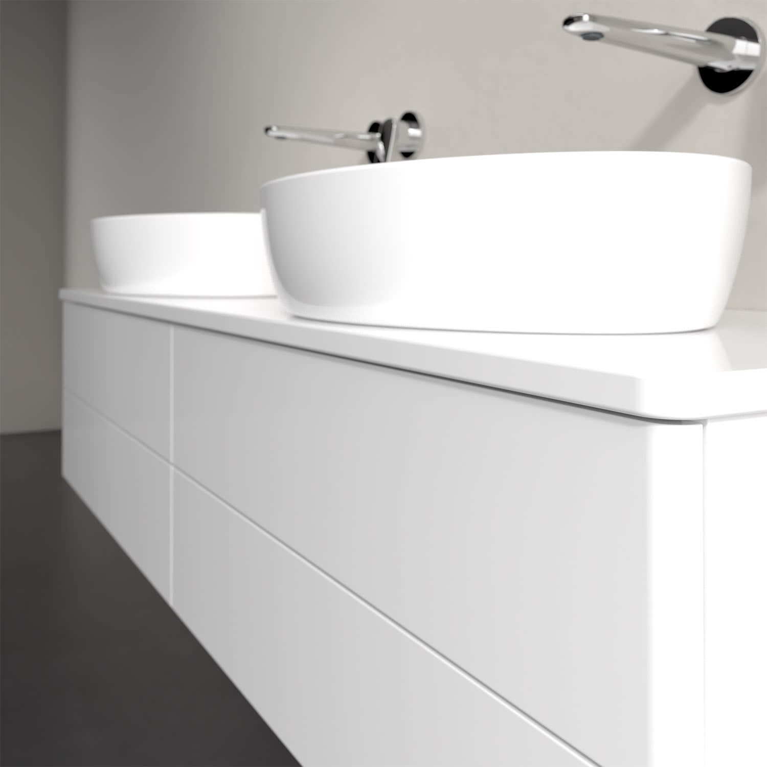 Der wandhängende Antao Waschtischunterschrank für zwei Aufsatzwaschtische bietet mit seinen vier Auszügen und seiner erstaunlichen Größe viel Platz zum Verstauen von Utensilien im Badezimmer. Inspiriert von der Natur überzeugt der Unterschrank auch optisch mit sanfter Formsprache und abgerundete Kanten. Die grifflosen Auszüge sind mit der Push-to-Open Funktion ausgestattet und verfügen über einen Antirutschboden, damit Utensilien sicher verstaut werden können. Mit seiner Vollauszug- und Selbsteinzug-Funktion ist der Schrank praktisch und leicht zu bedienen. Qualität von Villeroy & Boch! Für eine besonders leichte Pflege sorgt die mehrschichtig deckend lackierte Oberfläche.