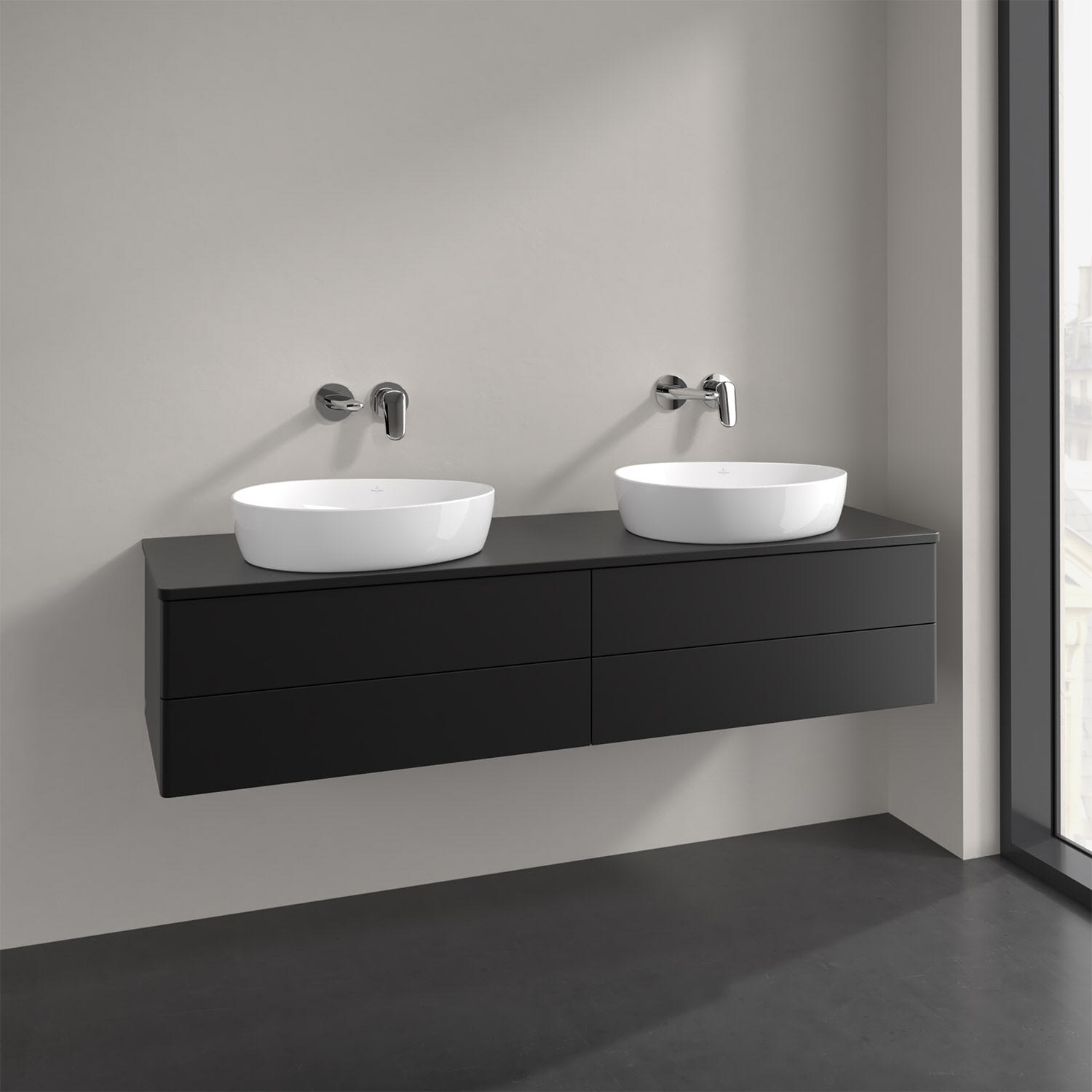 Der wandhängende Antao Waschtischunterschrank für zwei Aufsatzwaschtische bietet mit seinen vier Auszügen und seiner erstaunlichen Größe viel Platz zum Verstauen von Utensilien im Badezimmer. Inspiriert von der Natur überzeugt der Unterschrank auch optisch mit sanfter Formsprache und abgerundete Kanten. Die grifflosen Auszüge sind mit der Push-to-Open Funktion ausgestattet und verfügen über einen Antirutschboden, damit Utensilien sicher verstaut werden können. Mit seiner Vollauszug- und Selbsteinzug-Funktion ist der Schrank praktisch und leicht zu bedienen. Qualität von Villeroy & Boch! Für eine besonders leichte Pflege sorgt die mehrschichtig deckend lackierte Oberfläche.