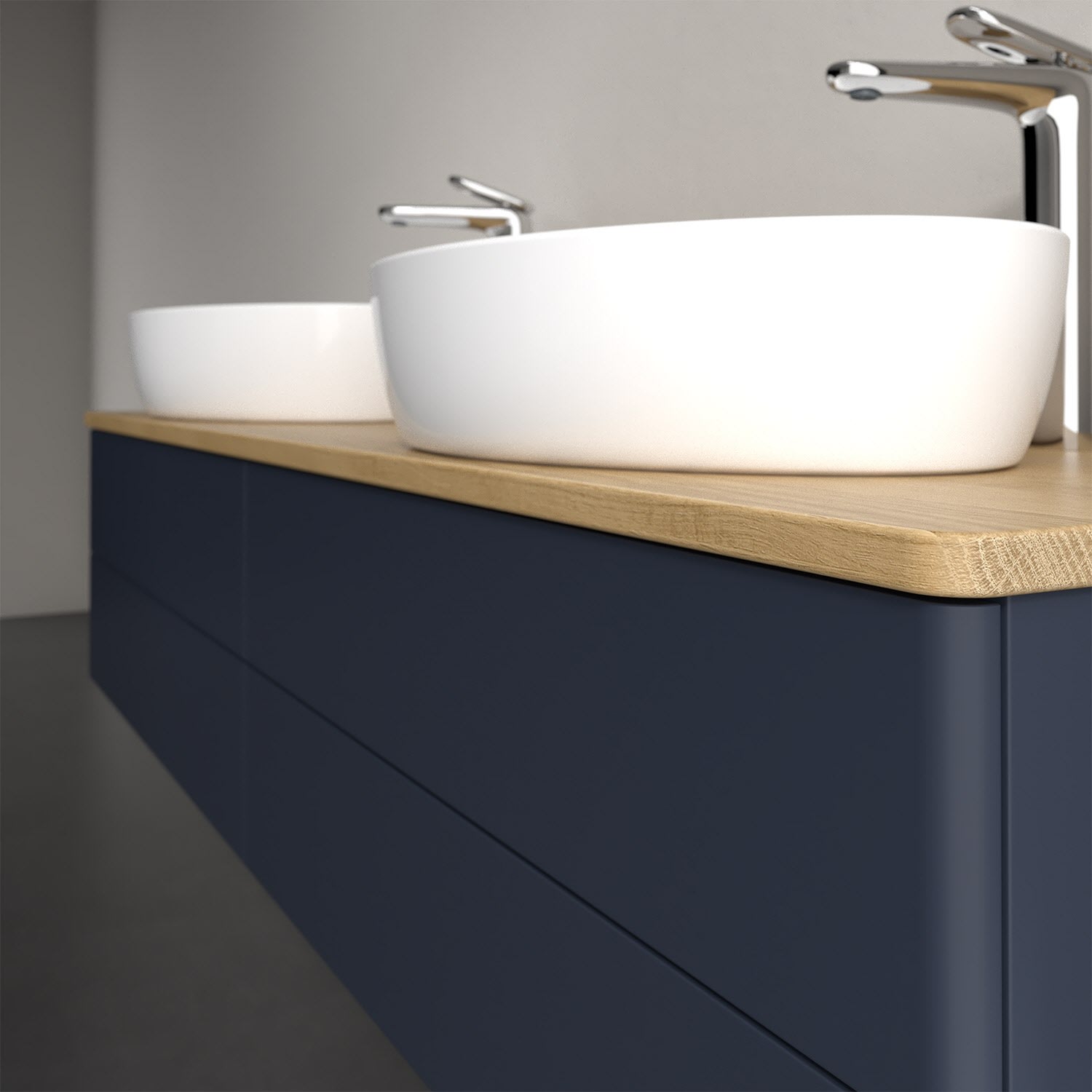 Der wandhängende Antao Waschtischunterschrank für zwei Aufsatzwaschtische bietet mit seinen vier Auszügen und seiner erstaunlichen Größe viel Platz zum Verstauen von Utensilien im Badezimmer. Inspiriert von der Natur überzeugt der Unterschrank auch optisch mit sanfter Formsprache und abgerundete Kanten. Die grifflosen Auszüge sind mit der Push-to-Open Funktion ausgestattet und verfügen über einen Antirutschboden, damit Utensilien sicher verstaut werden können. Mit seiner Vollauszug- und Selbsteinzug-Funktion ist der Schrank praktisch und leicht zu bedienen. Qualität von Villeroy & Boch! Für eine besonders leichte Pflege sorgt die mehrschichtig deckend lackierte Oberfläche. Bei der Ausführung in Massivholz wird dank des verarbeiteten Massivholzes jedes Möbel zu einem Unikat, das sich durch das lebendige Naturmaterial durch seine einzigartige Struktur und Maserung auszeichnet.