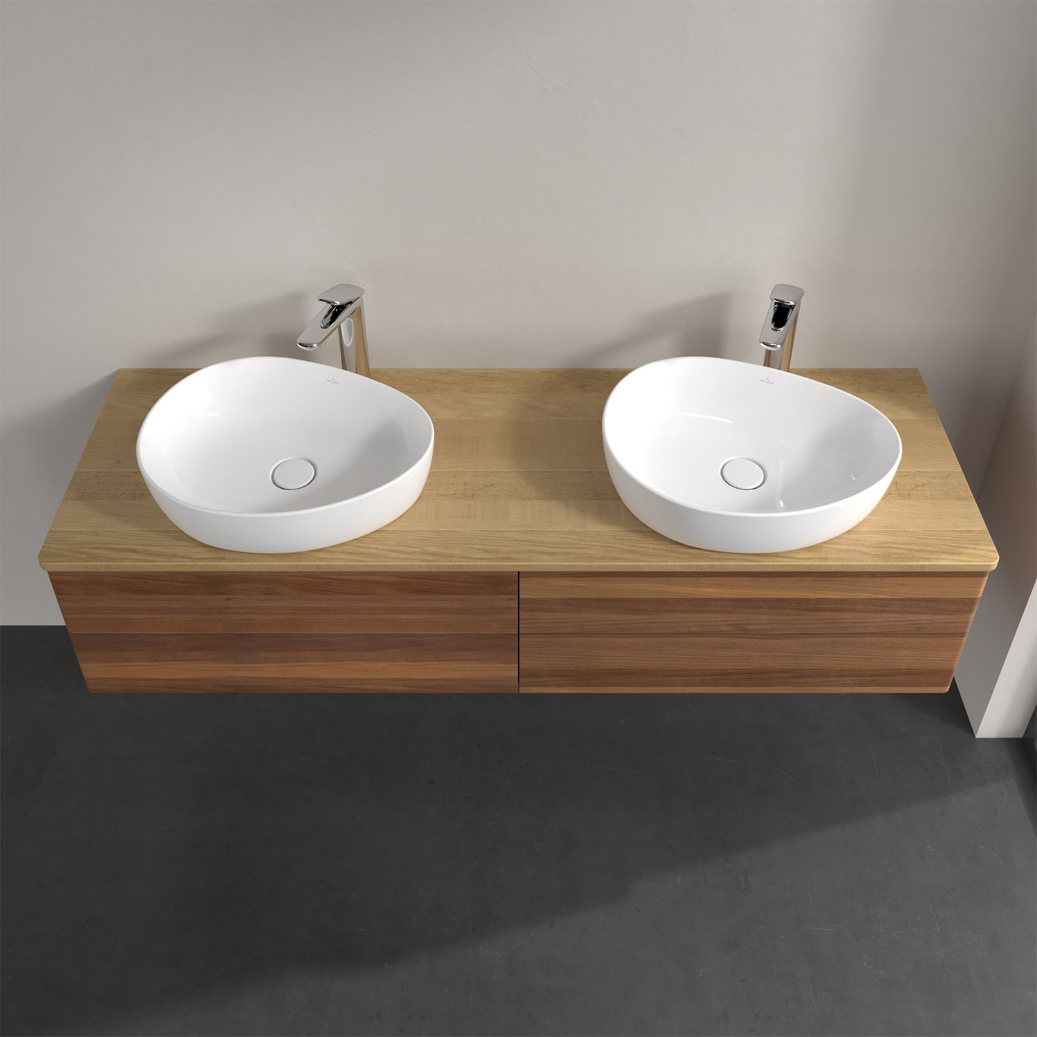 Der wandhängende Antao Waschtischunterschrank für zwei Aufsatzwaschtische bietet mit seinen vier Auszügen und seiner erstaunlichen Größe viel Platz zum Verstauen von Utensilien im Badezimmer. Inspiriert von der Natur überzeugt der Unterschrank auch optisch mit sanfter Formsprache und abgerundete Kanten. Die grifflosen Auszüge sind mit der Push-to-Open Funktion ausgestattet und verfügen über einen Antirutschboden, damit Utensilien sicher verstaut werden können. Mit seiner Vollauszug- und Selbsteinzug-Funktion ist der Schrank praktisch und leicht zu bedienen. Qualität von Villeroy & Boch! Für eine besonders leichte Pflege sorgt die mehrschichtig deckend lackierte Oberfläche. Bei der Ausführung in Massivholz wird dank des verarbeiteten Massivholzes jedes Möbel zu einem Unikat, das sich durch das lebendige Naturmaterial durch seine einzigartige Struktur und Maserung auszeichnet.