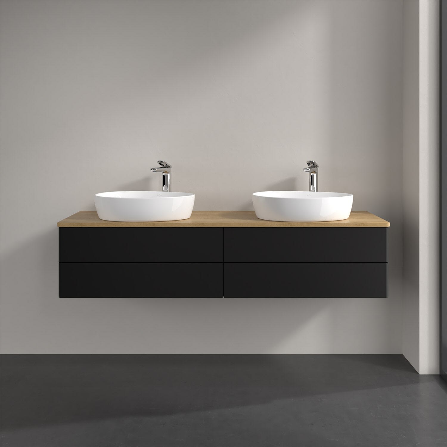 Der wandhängende Antao Waschtischunterschrank für zwei Aufsatzwaschtische bietet mit seinen vier Auszügen und seiner erstaunlichen Größe viel Platz zum Verstauen von Utensilien im Badezimmer. Inspiriert von der Natur überzeugt der Unterschrank auch optisch mit sanfter Formsprache und abgerundete Kanten. Die grifflosen Auszüge sind mit der Push-to-Open Funktion ausgestattet und verfügen über einen Antirutschboden, damit Utensilien sicher verstaut werden können. Mit seiner Vollauszug- und Selbsteinzug-Funktion ist der Schrank praktisch und leicht zu bedienen. Qualität von Villeroy & Boch! Für eine besonders leichte Pflege sorgt die mehrschichtig deckend lackierte Oberfläche. Bei der Ausführung in Massivholz wird dank des verarbeiteten Massivholzes jedes Möbel zu einem Unikat, das sich durch das lebendige Naturmaterial durch seine einzigartige Struktur und Maserung auszeichnet.