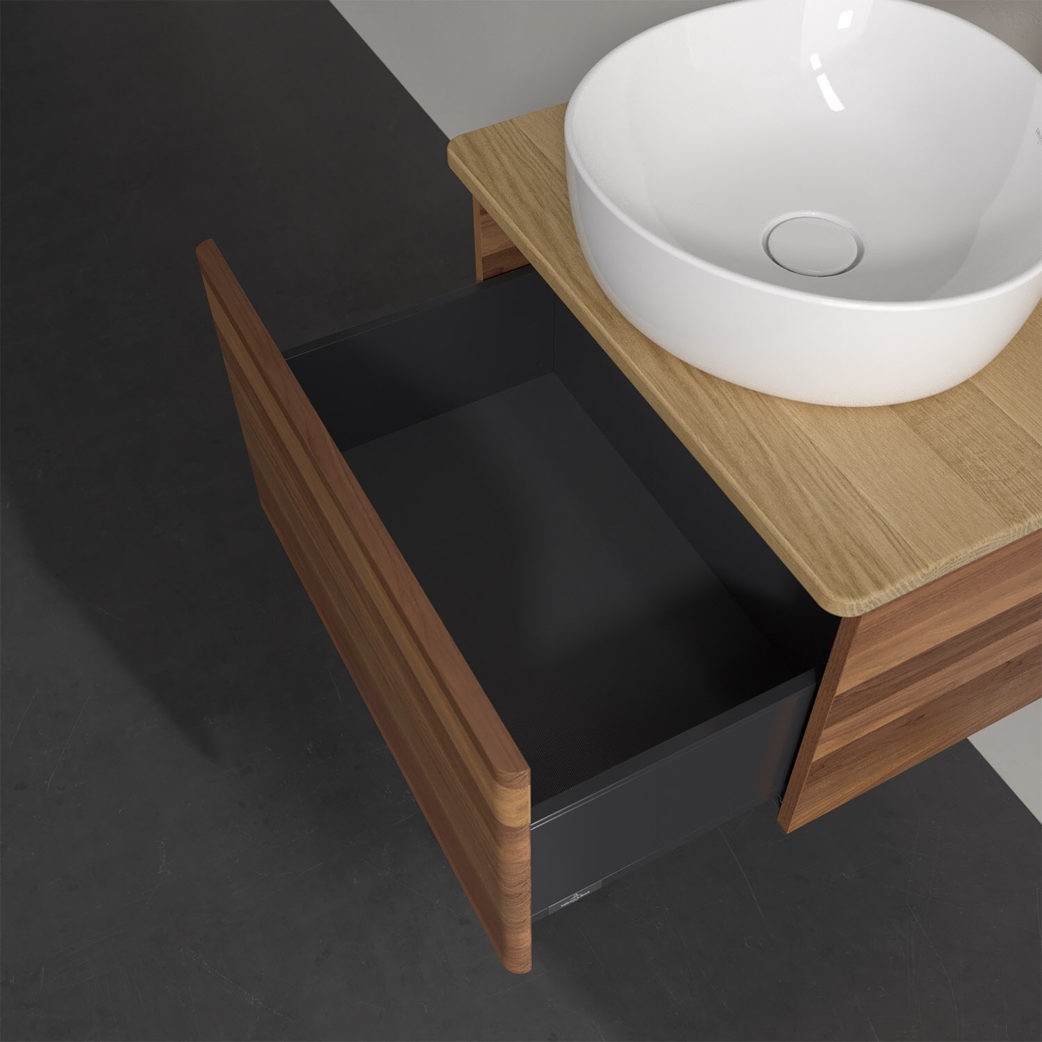 Wenig Platz im Badezimmer und dennoch soll es gemütlich und ordentlich sein? Dann ist der wandhängende Antao Waschtischunterschrank mit seinen sanft abgerundeten Kanten die ideale Lösung. Das geräumige Möbel bietet ausreichend Stauraum für alle nötigen Badutensilien. Zum Öffnen genügt dank der Push-to-Open Funktion ein leichter Druck auf den extra hohen Auszug, der sich dann in seiner vollen Tiefe öffnet. Das garantiert den benötigen Überblick! Praktisch ist auch der integrierte Antirutschboden und die SoftClosing Funktion, die ein Umfallen oder Verrutschen der verstauten Produkte verhindern. Villeroy & Boch hat alles durchdacht! Für eine besonders leichte Pflege sorgt die mehrschichtig deckend lackierte Oberfläche. Bei der Ausführung in Massivholz wird dank des verarbeiteten Massivholzes jedes Möbel zu einem Unikat, das sich durch das lebendige Naturmaterial durch seine einzigartige Struktur und Maserung auszeichnet.