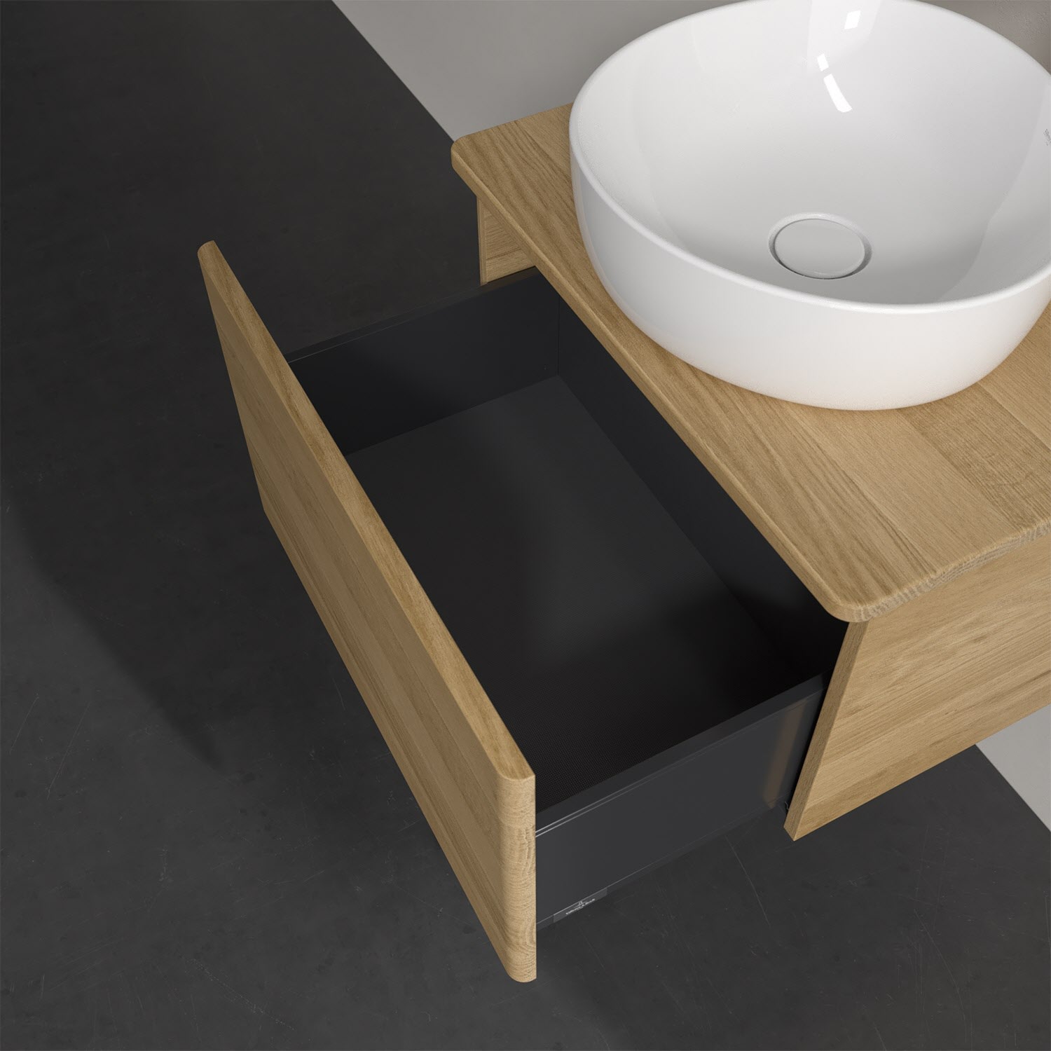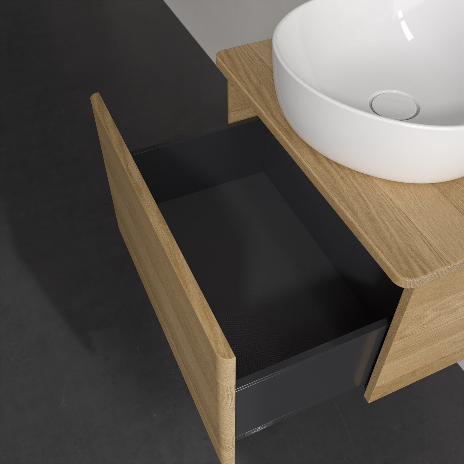 Wenig Platz im Badezimmer und dennoch soll es gemütlich und ordentlich sein? Dann ist der wandhängende Antao Waschtischunterschrank mit seinen sanft abgerundeten Kanten die ideale Lösung. Das geräumige Möbel bietet ausreichend Stauraum für alle nötigen Badutensilien. Zum Öffnen genügt dank der Push-to-Open Funktion ein leichter Druck auf den extra hohen Auszug, der sich dann in seiner vollen Tiefe öffnet. Das garantiert den benötigen Überblick! Praktisch ist auch der integrierte Antirutschboden und die SoftClosing Funktion, die ein Umfallen oder Verrutschen der verstauten Produkte verhindern. Villeroy & Boch hat alles durchdacht! Für eine besonders leichte Pflege sorgt die mehrschichtig deckend lackierte Oberfläche. Bei der Ausführung in Massivholz wird dank des verarbeiteten Massivholzes jedes Möbel zu einem Unikat, das sich durch das lebendige Naturmaterial durch seine einzigartige Struktur und Maserung auszeichnet.