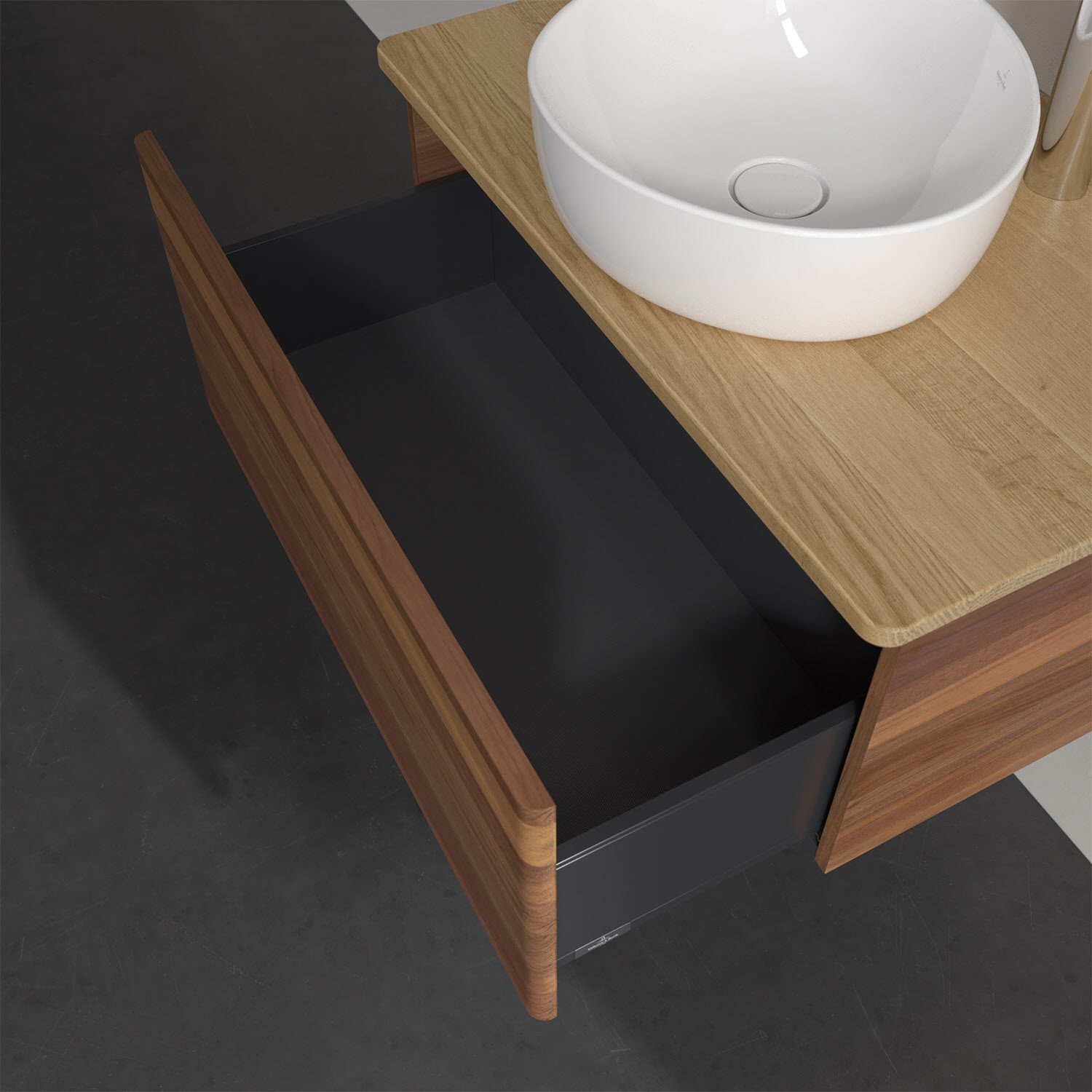 Mit dem wandhängenden Waschtischunterschrank der Kollektion Antao wird ein natürliches und gemütliches Flair am Waschplatz geschaffen. Dafür sorgen die sanfte Formsprache und die abgerundete Kanten des hochwertigen Badmöbels. Die wichtigsten Badutensilien für die tägliche Routine können seitlich des Waschtischs auf die Waschtischplatte gestellt werden. Ansonsten bietet ein extra hoher Auszug inklusive Antirutschboden ausreichend Platz für weitere Produkte, die garantiert bleiben, wo sie hingehören. Der Unterschrank verfügt zudem über einen Vollauszug und Selbsteinzug mit SoftClosing Funktion, damit er bequem und mühelos geöffnet und geschlossen werden kann. Gewohnte Qualität von Villeroy & Boch! Für eine besonders leichte Pflege sorgt die mehrschichtig deckend lackierte Oberfläche. Bei der Ausführung in Massivholz wird dank des verarbeiteten Massivholzes jedes Möbel zu einem Unikat, das sich durch das lebendige Naturmaterial durch seine einzigartige Struktur und Maserung auszeichnet.