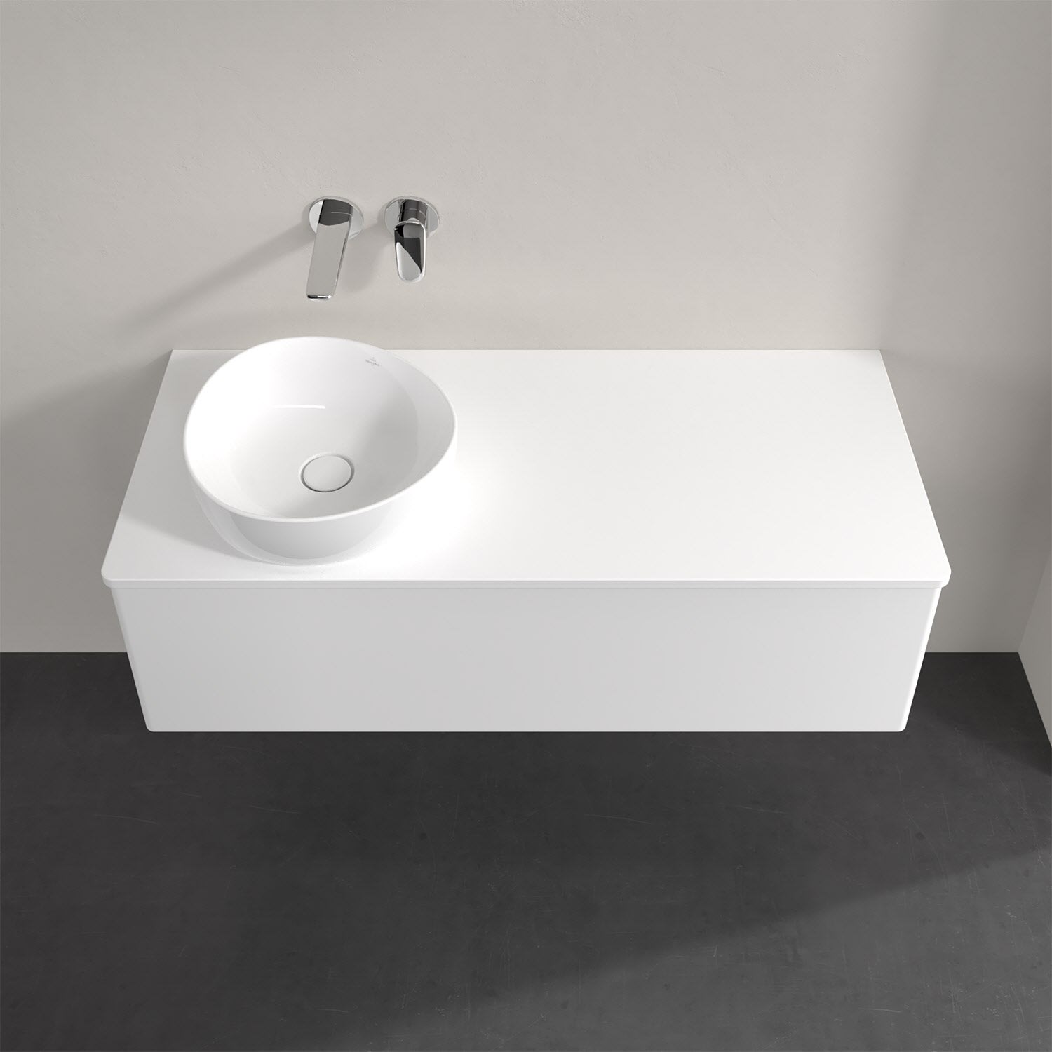 Für diesen Waschbeckenunterschrank stehen Ihnen Aufsatzwaschtische aus verschiedenen Serien zur Verfügung (siehe "Passliste" unter Downloads). Ein ausgewähltes Beispiel finden Sie im Zubehör. Den Waschtisch bitte separat mitbestellen.