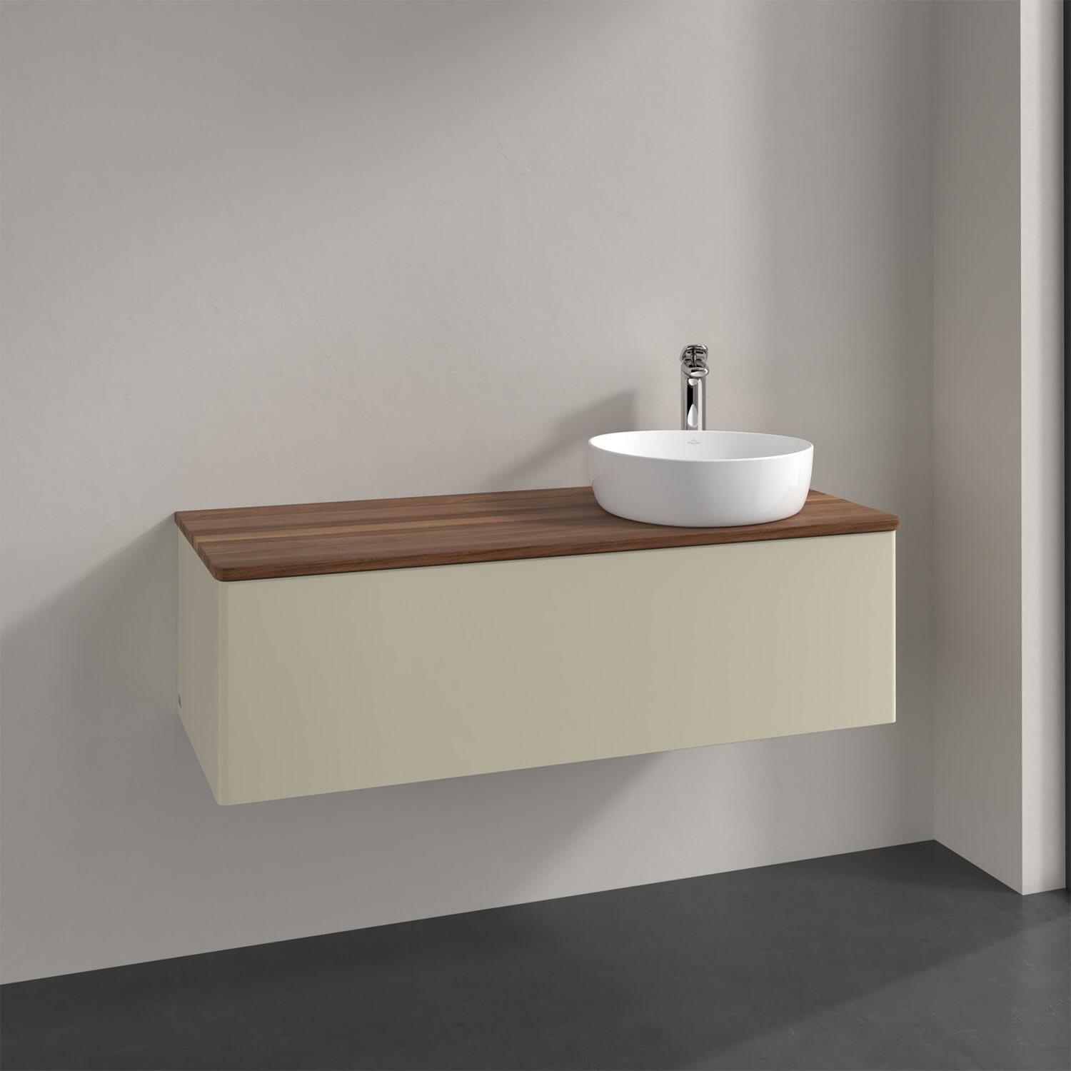 Für diesen Waschbeckenunterschrank stehen Ihnen Aufsatzwaschtische aus verschiedenen Serien zur Verfügung (siehe "Passliste" unter Downloads). Ein ausgewähltes Beispiel finden Sie im Zubehör. Den Waschtisch bitte separat mitbestellen.