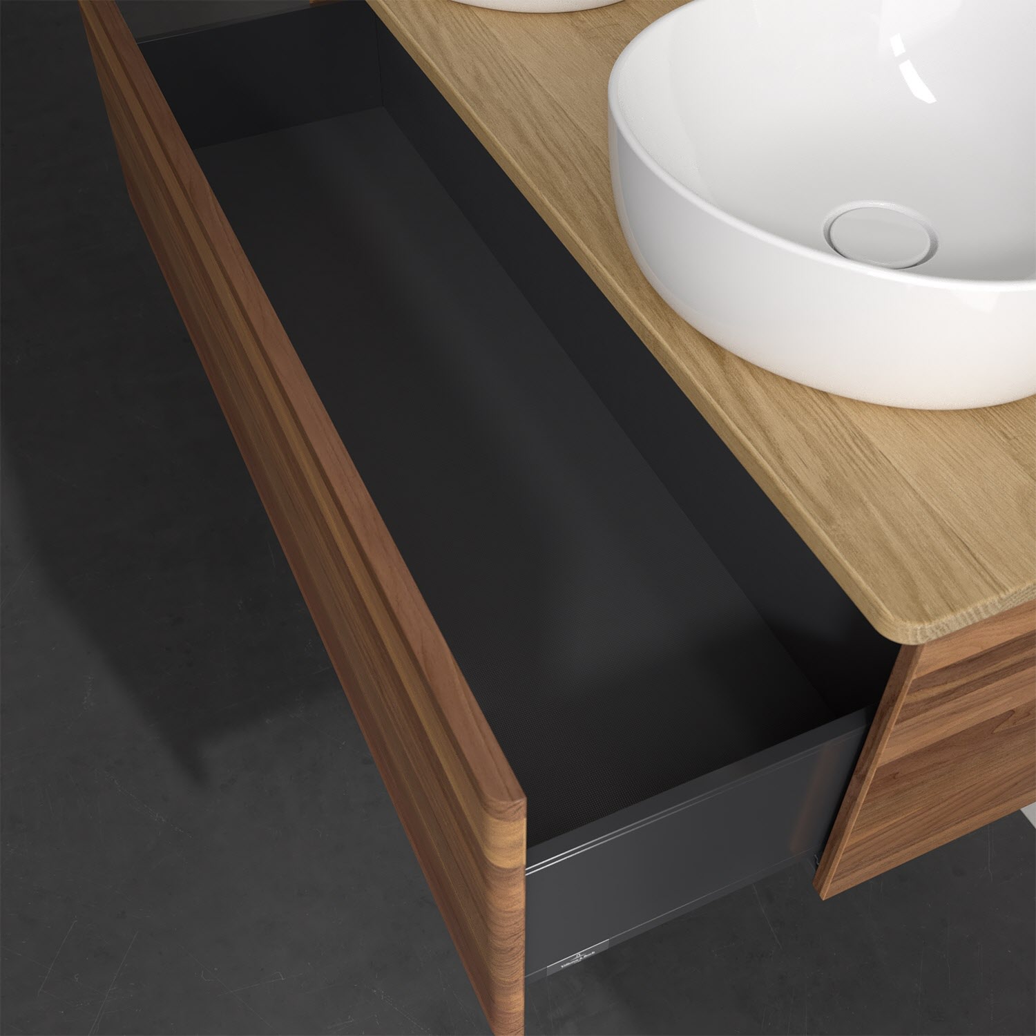 Der wandhängende Antao Waschtischunterschrank von Villeroy & Boch bietet nicht nur jede Menge Stauraum – er ist dank seines naturinspirierten Designs mit seinen abgerundeten Kanten auch noch besonders stilvoll und schafft eine gemütliche Atmosphäre im Badezimmer. Kombiniert mit zwei passenden Aufsatzwaschtischen also die ideale Wahl. Ein extra hoher Auszug bietet viel Platz, um alles Notwendige zu verstauen und Ordnung zu halten. Öffnen lässt er sich durch leichten Druck auf die grifflose Front. Dank Vollauszug hat man immer alles im Blick und der Antirutschboden verhindert ein Umfallen oder Verrutschen der Gegenstände. Einfach clever! Für eine besonders leichte Pflege sorgt die mehrschichtig deckend lackierte Oberfläche. Bei der Ausführung in Massivholz wird dank des verarbeiteten Massivholzes jedes Möbel zu einem Unikat, das sich durch das lebendige Naturmaterial durch seine einzigartige Struktur und Maserung auszeichnet.