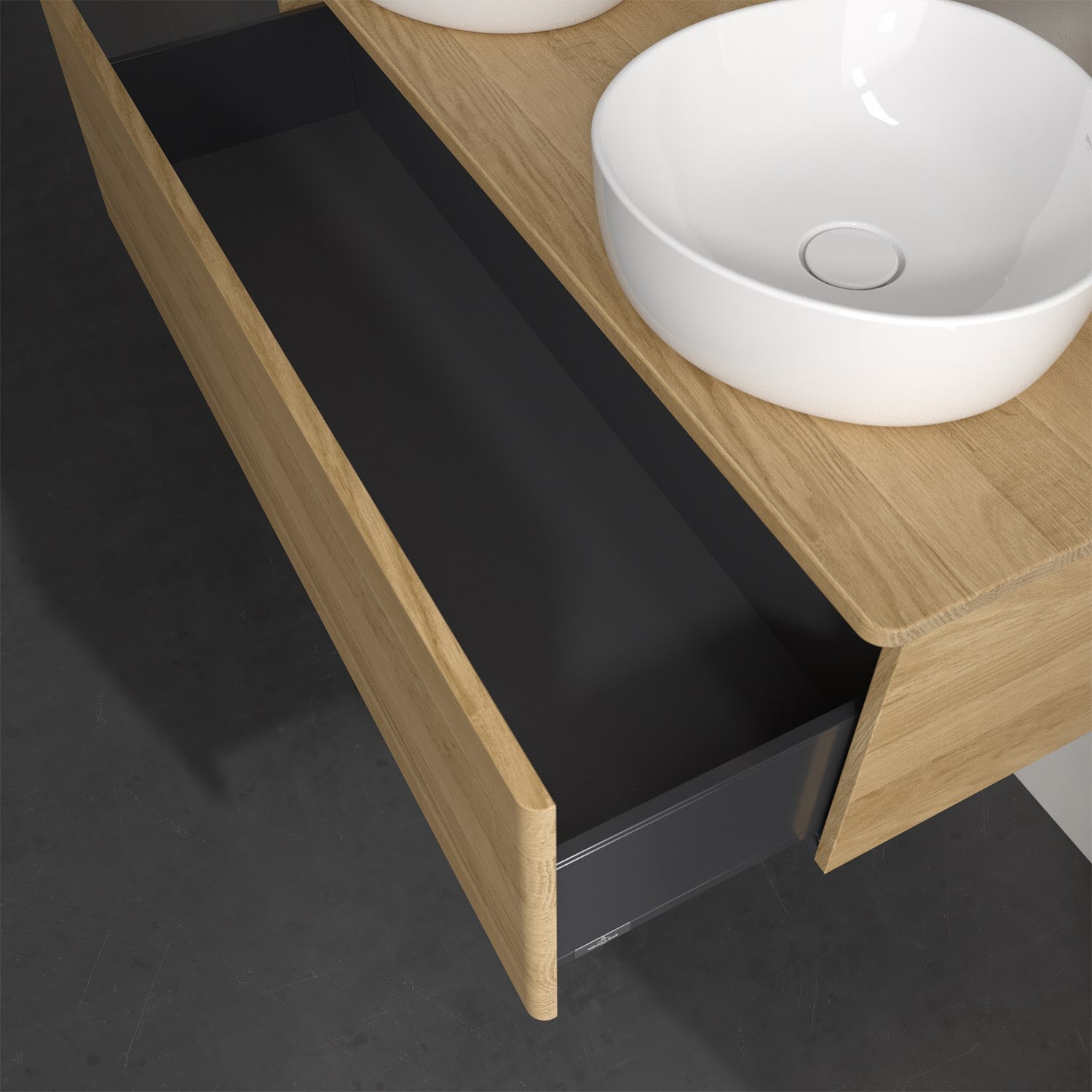 Der wandhängende Antao Waschtischunterschrank von Villeroy & Boch bietet nicht nur jede Menge Stauraum – er ist dank seines naturinspirierten Designs mit seinen abgerundeten Kanten auch noch besonders stilvoll und schafft eine gemütliche Atmosphäre im Badezimmer. Kombiniert mit zwei passenden Aufsatzwaschtischen also die ideale Wahl. Ein extra hoher Auszug bietet viel Platz, um alles Notwendige zu verstauen und Ordnung zu halten. Öffnen lässt er sich durch leichten Druck auf die grifflose Front. Dank Vollauszug hat man immer alles im Blick und der Antirutschboden verhindert ein Umfallen oder Verrutschen der Gegenstände. Einfach clever! Für eine besonders leichte Pflege sorgt die mehrschichtig deckend lackierte Oberfläche. Bei der Ausführung in Massivholz wird dank des verarbeiteten Massivholzes jedes Möbel zu einem Unikat, das sich durch das lebendige Naturmaterial durch seine einzigartige Struktur und Maserung auszeichnet.