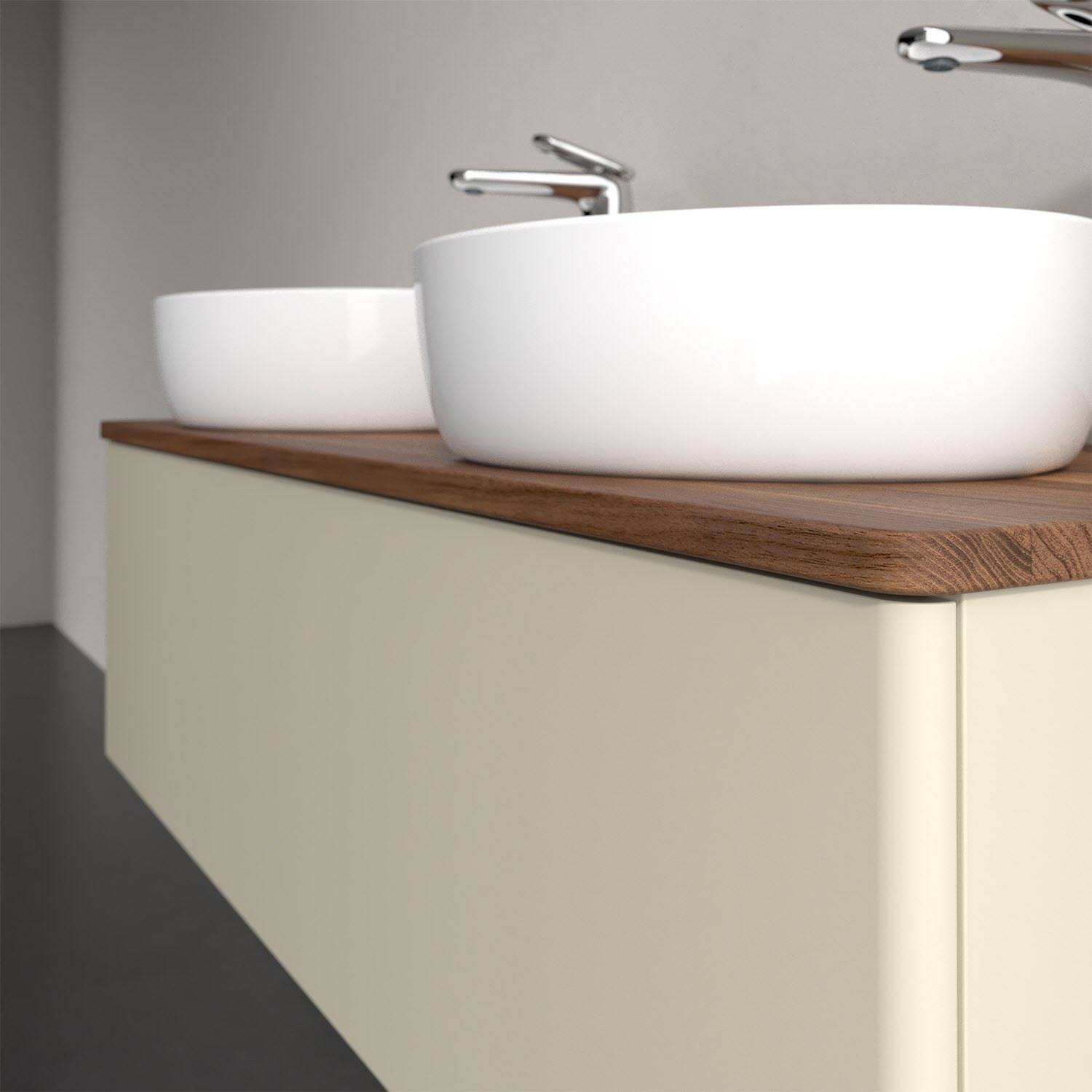 Der wandhängende Antao Waschtischunterschrank von Villeroy & Boch bietet nicht nur jede Menge Stauraum – er ist dank seines naturinspirierten Designs mit seinen abgerundeten Kanten auch noch besonders stilvoll und schafft eine gemütliche Atmosphäre im Badezimmer. Kombiniert mit zwei passenden Aufsatzwaschtischen also die ideale Wahl. Ein extra hoher Auszug bietet viel Platz, um alles Notwendige zu verstauen und Ordnung zu halten. Öffnen lässt er sich durch leichten Druck auf die grifflose Front. Dank Vollauszug hat man immer alles im Blick und der Antirutschboden verhindert ein Umfallen oder Verrutschen der Gegenstände. Einfach clever! Für eine besonders leichte Pflege sorgt die mehrschichtig deckend lackierte Oberfläche. Bei der Ausführung in Massivholz wird dank des verarbeiteten Massivholzes jedes Möbel zu einem Unikat, das sich durch das lebendige Naturmaterial durch seine einzigartige Struktur und Maserung auszeichnet.