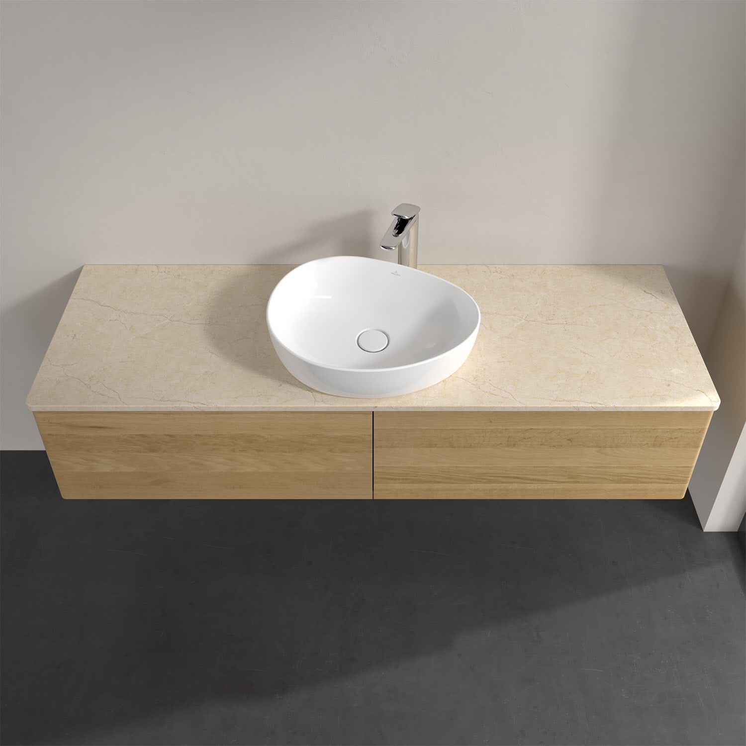 Für diesen Waschbeckenunterschrank stehen Ihnen Aufsatzwaschtische aus verschiedenen Serien zur Verfügung (siehe "Passliste" unter Downloads). Ein ausgewähltes Beispiel finden Sie im Zubehör. Den Waschtisch bitte separat mitbestellen.