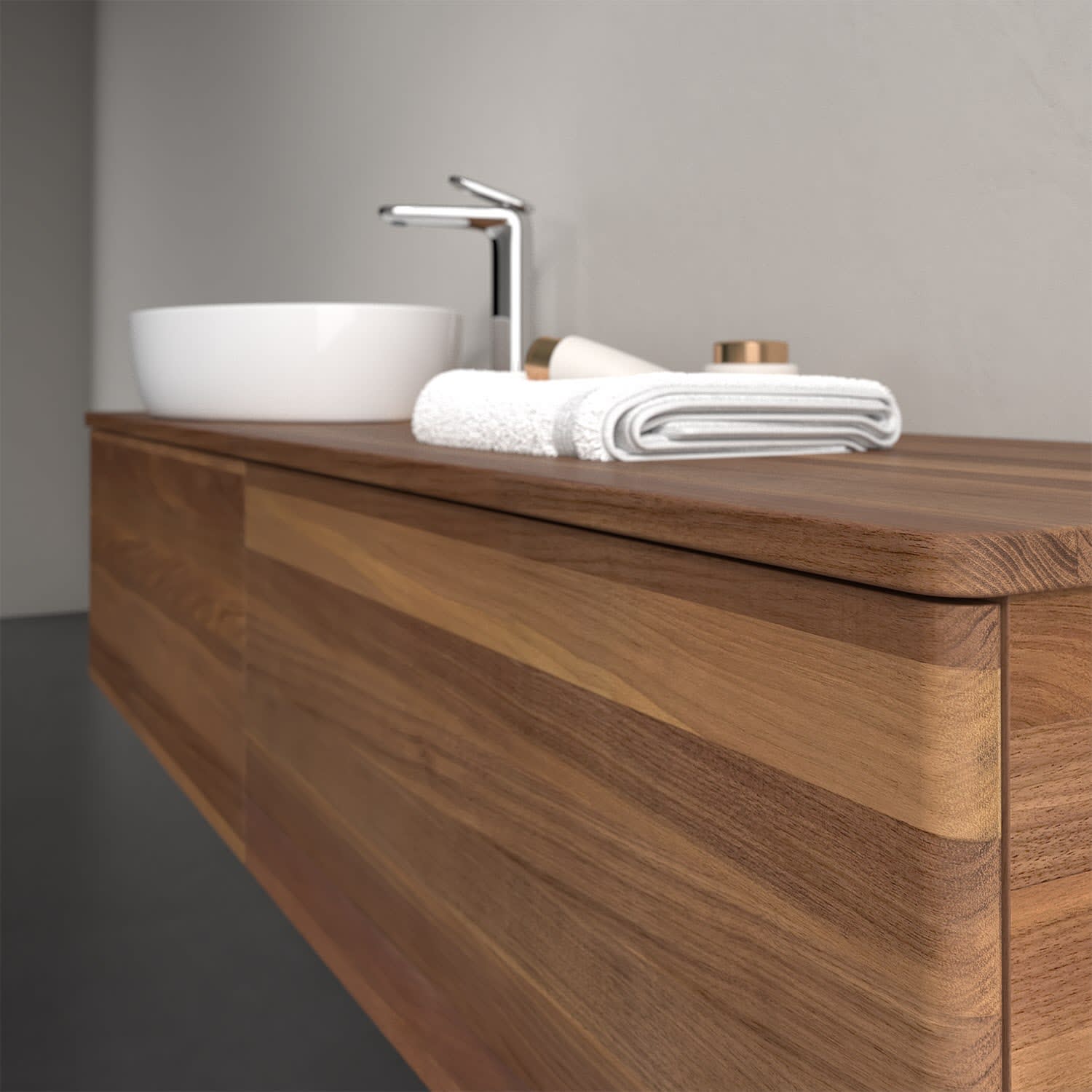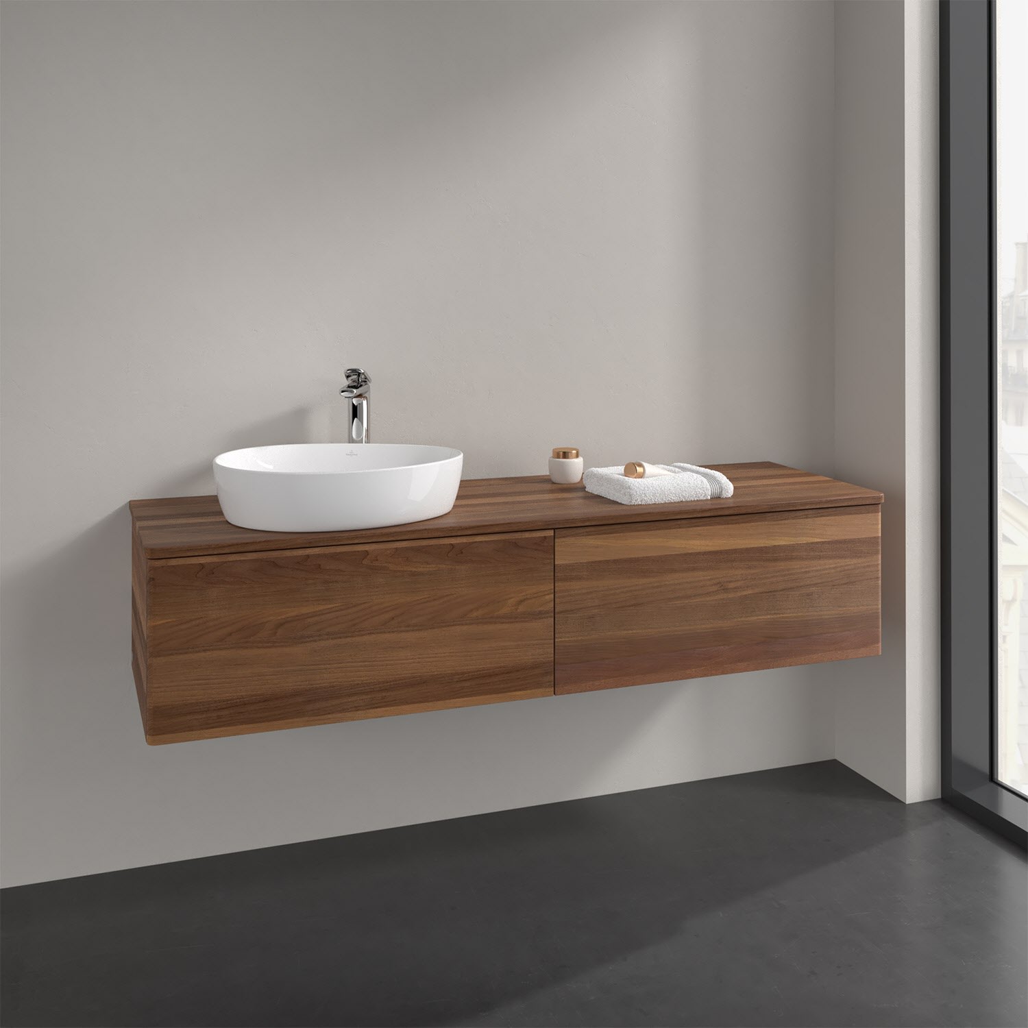 Der wandhängende Antao Waschtischunterschrank bietet mit seinen beiden extra hohen Auszügen und seiner erstaunlichen Größe viel Platz zum Verstauen von Utensilien im Badezimmer. Dank des seitlich platzierten Aufsatzwaschtischs gibt es daneben weiteren Platz für Handtücher, Seifenspender & Co. auf der Waschtischplatte. Inspiriert von der Natur überzeugt der Unterschrank auch optisch mit sanfter Formsprache und abgerundete Kanten. Die grifflosen Auszüge sind mit der Push-to-Open Funktion ausgestattet und verfügen über einen Antirutschboden, damit Utensilien sicher verstaut werden können. Mit seiner Vollauszug- und Selbsteinzug-Funktion ist der Schrank praktisch und leicht zu bedienen. Qualität von Villeroy & Boch! Für eine besonders leichte Pflege sorgt die mehrschichtig deckend lackierte Oberfläche. Bei der Ausführung in Massivholz wird dank des verarbeiteten Massivholzes jedes Möbel zu einem Unikat, das sich durch das lebendige Naturmaterial durch seine einzigartige Struktur und Maserung auszeichnet.