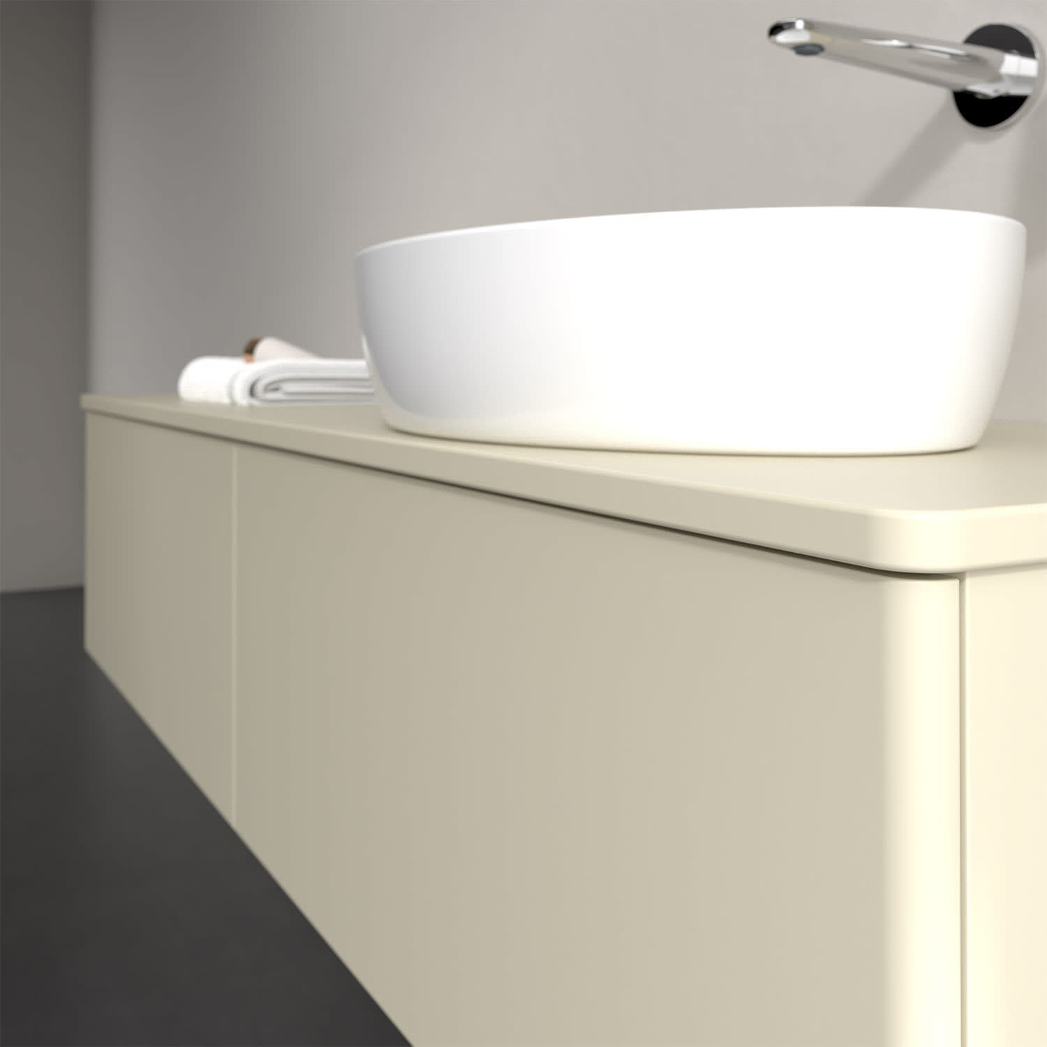 Der wandhängende Antao Waschtischunterschrank bietet mit seinen beiden extra hohen Auszügen und seiner erstaunlichen Größe viel Platz zum Verstauen von Utensilien im Badezimmer. Dank des seitlich platzierten Aufsatzwaschtischs gibt es daneben weiteren Platz für Handtücher, Seifenspender & Co. auf der Waschtischplatte. Inspiriert von der Natur überzeugt der Unterschrank auch optisch mit sanfter Formsprache und abgerundete Kanten. Die grifflosen Auszüge sind mit der Push-to-Open Funktion ausgestattet und verfügen über einen Antirutschboden, damit Utensilien sicher verstaut werden können. Mit seiner Vollauszug- und Selbsteinzug-Funktion ist der Schrank praktisch und leicht zu bedienen. Qualität von Villeroy & Boch! Für eine besonders leichte Pflege sorgt die mehrschichtig deckend lackierte Oberfläche.