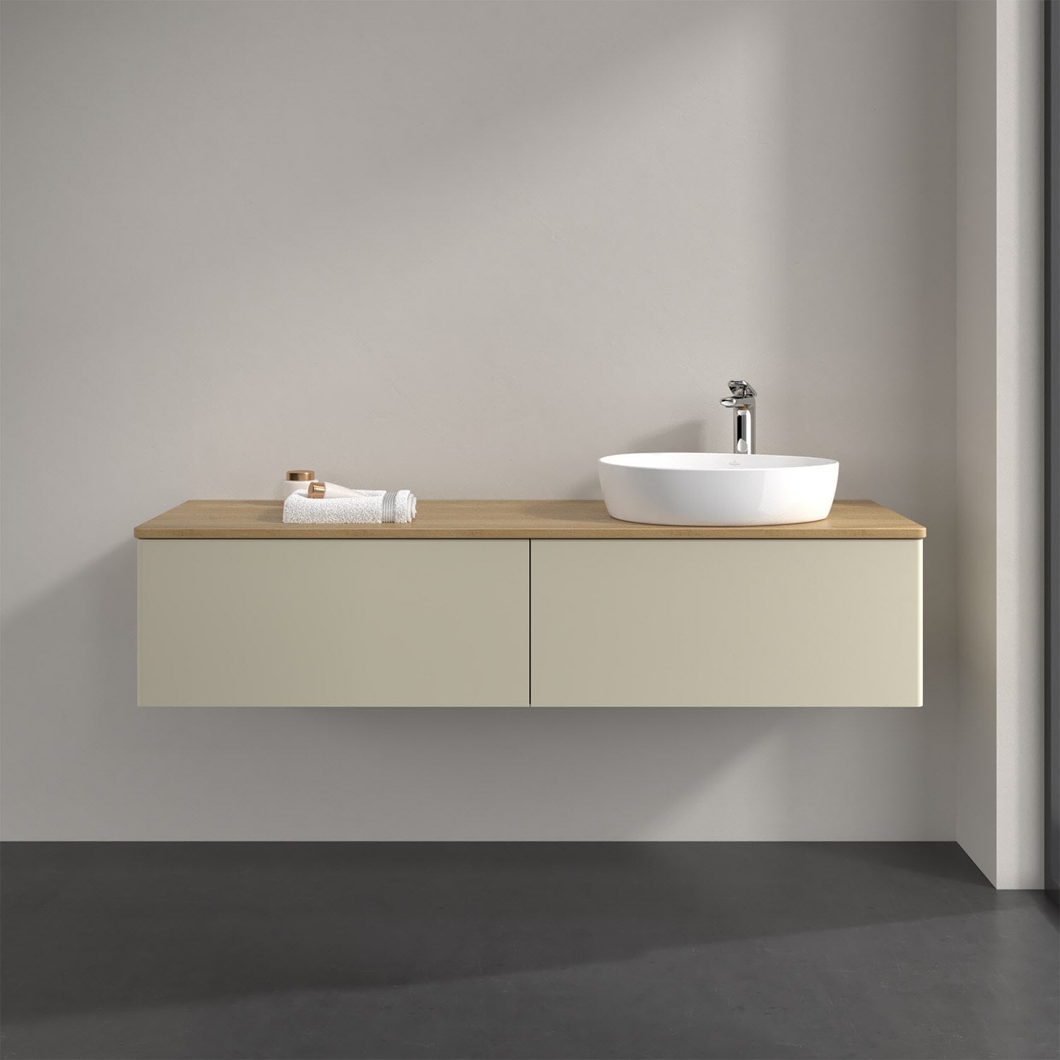 Der wandhängende Antao Waschtischunterschrank bietet mit seinen beiden extra hohen Auszügen und seiner erstaunlichen Größe viel Platz zum Verstauen von Utensilien im Badezimmer. Dank des seitlich platzierten Aufsatzwaschtischs gibt es daneben weiteren Platz für Handtücher, Seifenspender & Co. auf der Waschtischplatte. Inspiriert von der Natur überzeugt der Unterschrank auch optisch mit sanfter Formsprache und abgerundete Kanten. Die grifflosen Auszüge sind mit der Push-to-Open Funktion ausgestattet und verfügen über einen Antirutschboden, damit Utensilien sicher verstaut werden können. Mit seiner Vollauszug- und Selbsteinzug-Funktion ist der Schrank praktisch und leicht zu bedienen. Qualität von Villeroy & Boch! Für eine besonders leichte Pflege sorgt die mehrschichtig deckend lackierte Oberfläche. Bei der Ausführung in Massivholz wird dank des verarbeiteten Massivholzes jedes Möbel zu einem Unikat, das sich durch das lebendige Naturmaterial durch seine einzigartige Struktur und Maserung auszeichnet.