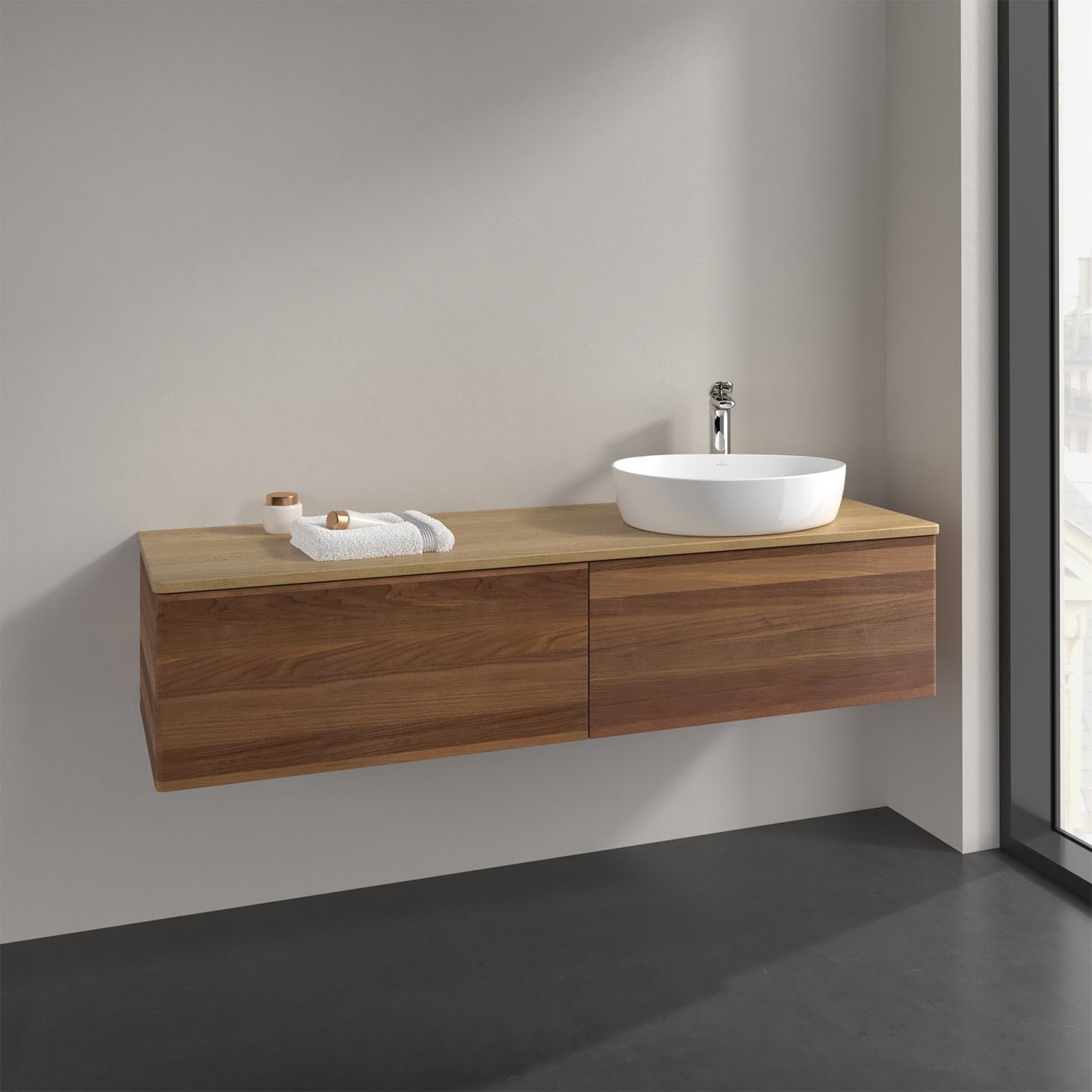 Der wandhängende Antao Waschtischunterschrank bietet mit seinen beiden extra hohen Auszügen und seiner erstaunlichen Größe viel Platz zum Verstauen von Utensilien im Badezimmer. Dank des seitlich platzierten Aufsatzwaschtischs gibt es daneben weiteren Platz für Handtücher, Seifenspender & Co. auf der Waschtischplatte. Inspiriert von der Natur überzeugt der Unterschrank auch optisch mit sanfter Formsprache und abgerundete Kanten. Die grifflosen Auszüge sind mit der Push-to-Open Funktion ausgestattet und verfügen über einen Antirutschboden, damit Utensilien sicher verstaut werden können. Mit seiner Vollauszug- und Selbsteinzug-Funktion ist der Schrank praktisch und leicht zu bedienen. Qualität von Villeroy & Boch! Für eine besonders leichte Pflege sorgt die mehrschichtig deckend lackierte Oberfläche. Bei der Ausführung in Massivholz wird dank des verarbeiteten Massivholzes jedes Möbel zu einem Unikat, das sich durch das lebendige Naturmaterial durch seine einzigartige Struktur und Maserung auszeichnet.