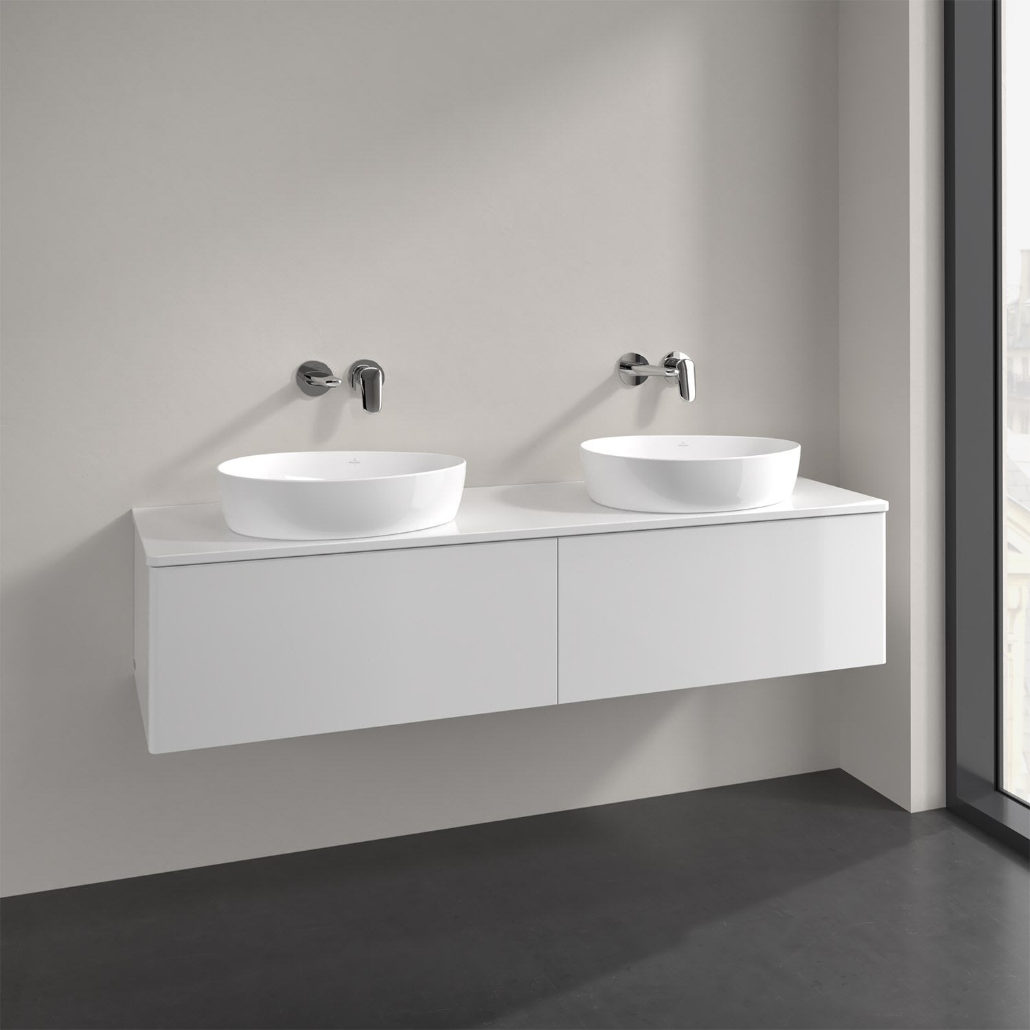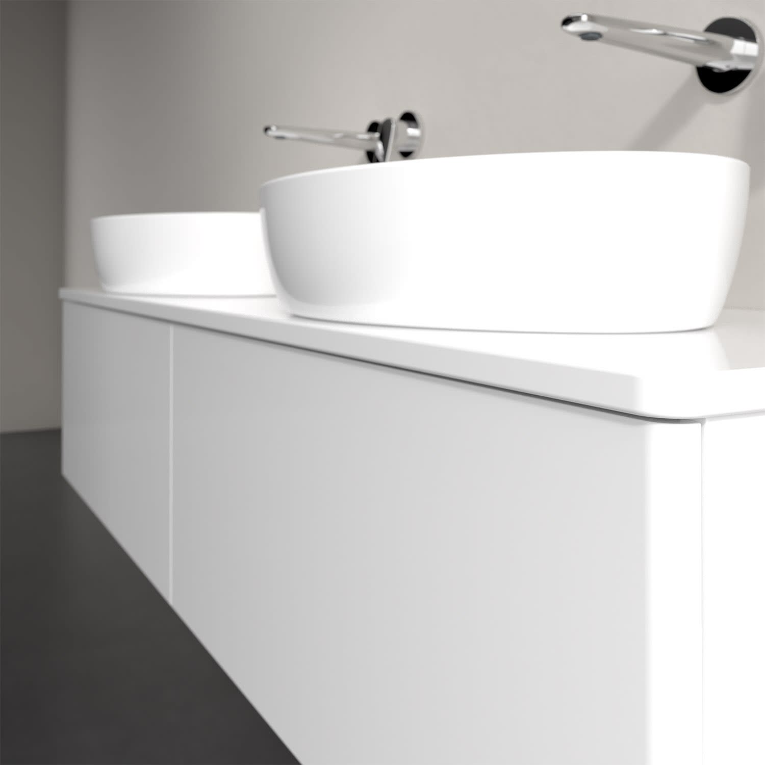 Der wandhängende Antao Waschtischunterschrank für zwei Aufsatzwaschtische bietet mit seinen beiden extra hohen Auszügen und seiner erstaunlichen Größe viel Platz zum Verstauen von Utensilien im Badezimmer. Inspiriert von der Natur überzeugt der Unterschrank auch optisch mit sanfter Formsprache und abgerundete Kanten. Die grifflosen Auszüge sind mit der Push-to-Open Funktion ausgestattet und verfügen über einen Antirutschboden, damit Utensilien sicher verstaut werden können. Mit seiner Vollauszug- und Selbsteinzug-Funktion ist der Schrank praktisch und leicht zu bedienen. Qualität von Villeroy & Boch! Für eine besonders leichte Pflege sorgt die mehrschichtig deckend lackierte Oberfläche.