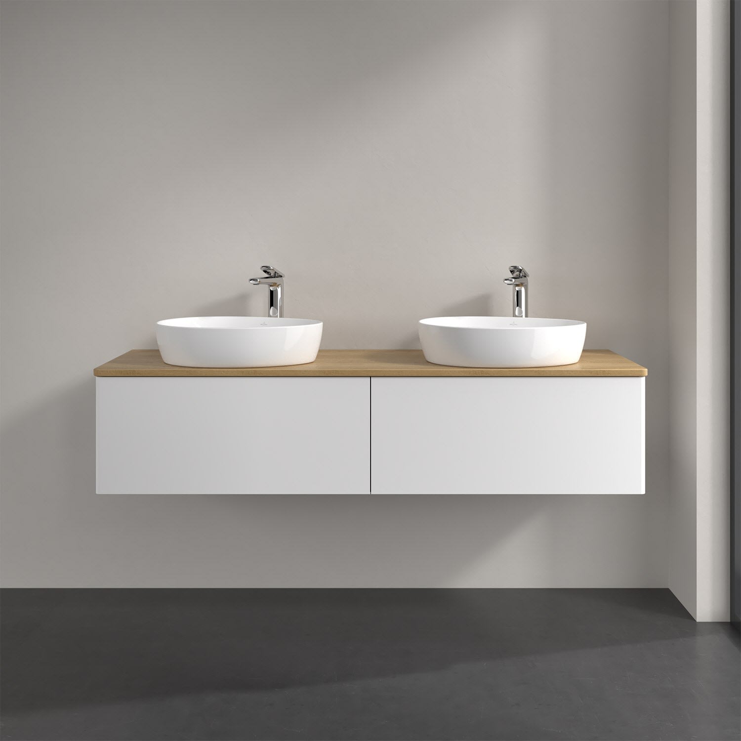 Der wandhängende Antao Waschtischunterschrank für zwei Aufsatzwaschtische bietet mit seinen beiden extra hohen Auszügen und seiner erstaunlichen Größe viel Platz zum Verstauen von Utensilien im Badezimmer. Inspiriert von der Natur überzeugt der Unterschrank auch optisch mit sanfter Formsprache und abgerundete Kanten. Die grifflosen Auszüge sind mit der Push-to-Open Funktion ausgestattet und verfügen über einen Antirutschboden, damit Utensilien sicher verstaut werden können. Mit seiner Vollauszug- und Selbsteinzug-Funktion ist der Schrank praktisch und leicht zu bedienen. Qualität von Villeroy & Boch! Für eine besonders leichte Pflege sorgt die mehrschichtig deckend lackierte Oberfläche. Bei der Ausführung in Massivholz wird dank des verarbeiteten Massivholzes jedes Möbel zu einem Unikat, das sich durch das lebendige Naturmaterial durch seine einzigartige Struktur und Maserung auszeichnet.