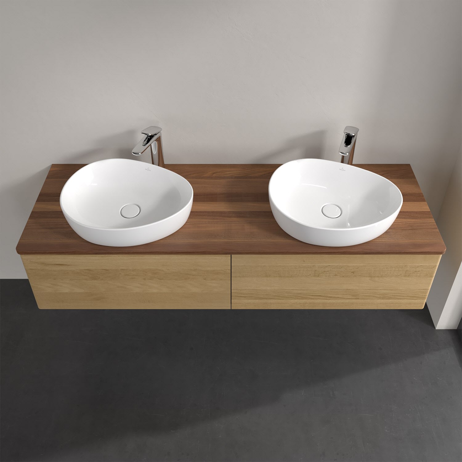 Der wandhängende Antao Waschtischunterschrank für zwei Aufsatzwaschtische bietet mit seinen beiden extra hohen Auszügen und seiner erstaunlichen Größe viel Platz zum Verstauen von Utensilien im Badezimmer. Inspiriert von der Natur überzeugt der Unterschrank auch optisch mit sanfter Formsprache und abgerundete Kanten. Die grifflosen Auszüge sind mit der Push-to-Open Funktion ausgestattet und verfügen über einen Antirutschboden, damit Utensilien sicher verstaut werden können. Mit seiner Vollauszug- und Selbsteinzug-Funktion ist der Schrank praktisch und leicht zu bedienen. Qualität von Villeroy & Boch! Für eine besonders leichte Pflege sorgt die mehrschichtig deckend lackierte Oberfläche. Bei der Ausführung in Massivholz wird dank des verarbeiteten Massivholzes jedes Möbel zu einem Unikat, das sich durch das lebendige Naturmaterial durch seine einzigartige Struktur und Maserung auszeichnet.