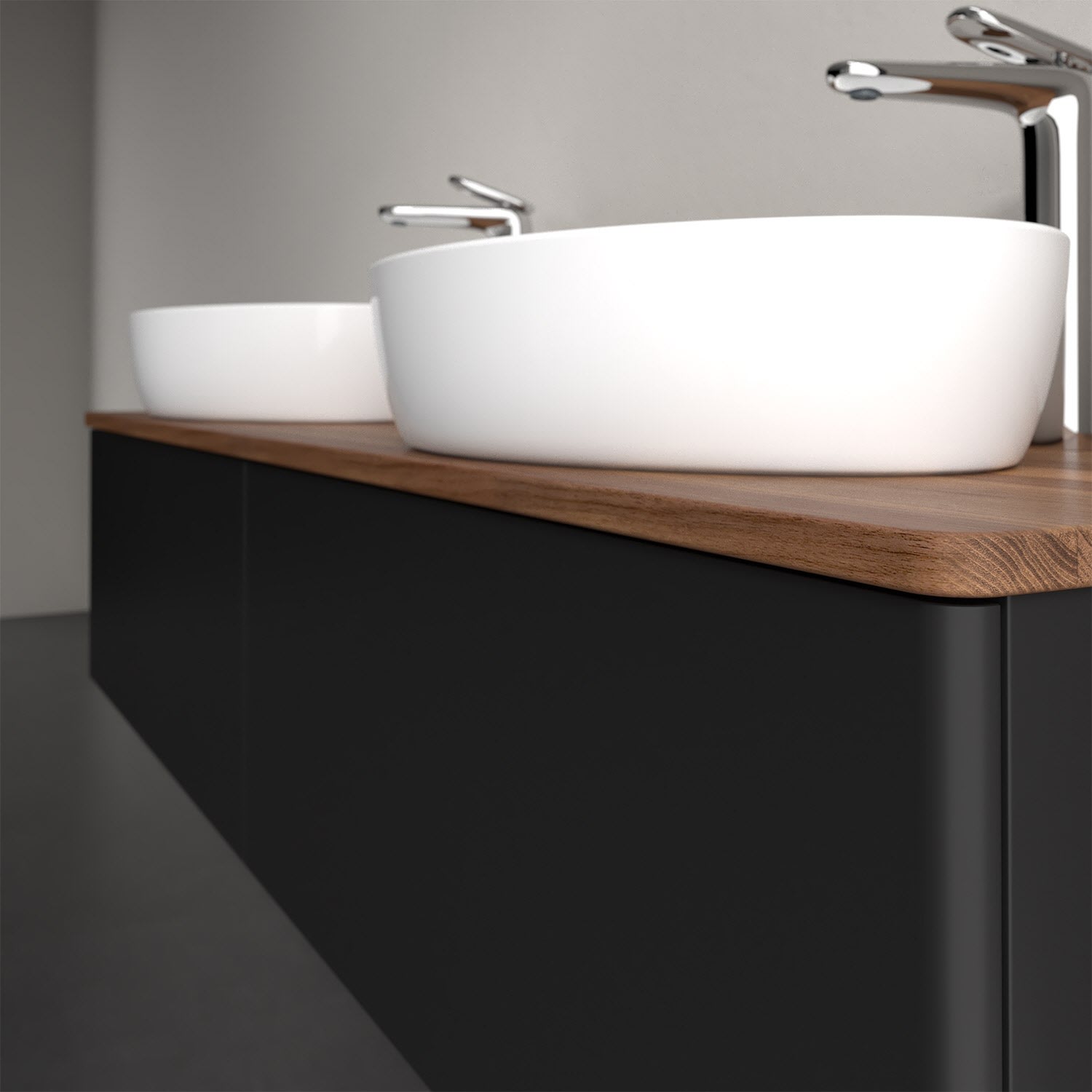 Der wandhängende Antao Waschtischunterschrank für zwei Aufsatzwaschtische bietet mit seinen beiden extra hohen Auszügen und seiner erstaunlichen Größe viel Platz zum Verstauen von Utensilien im Badezimmer. Inspiriert von der Natur überzeugt der Unterschrank auch optisch mit sanfter Formsprache und abgerundete Kanten. Die grifflosen Auszüge sind mit der Push-to-Open Funktion ausgestattet und verfügen über einen Antirutschboden, damit Utensilien sicher verstaut werden können. Mit seiner Vollauszug- und Selbsteinzug-Funktion ist der Schrank praktisch und leicht zu bedienen. Qualität von Villeroy & Boch! Für eine besonders leichte Pflege sorgt die mehrschichtig deckend lackierte Oberfläche. Bei der Ausführung in Massivholz wird dank des verarbeiteten Massivholzes jedes Möbel zu einem Unikat, das sich durch das lebendige Naturmaterial durch seine einzigartige Struktur und Maserung auszeichnet.