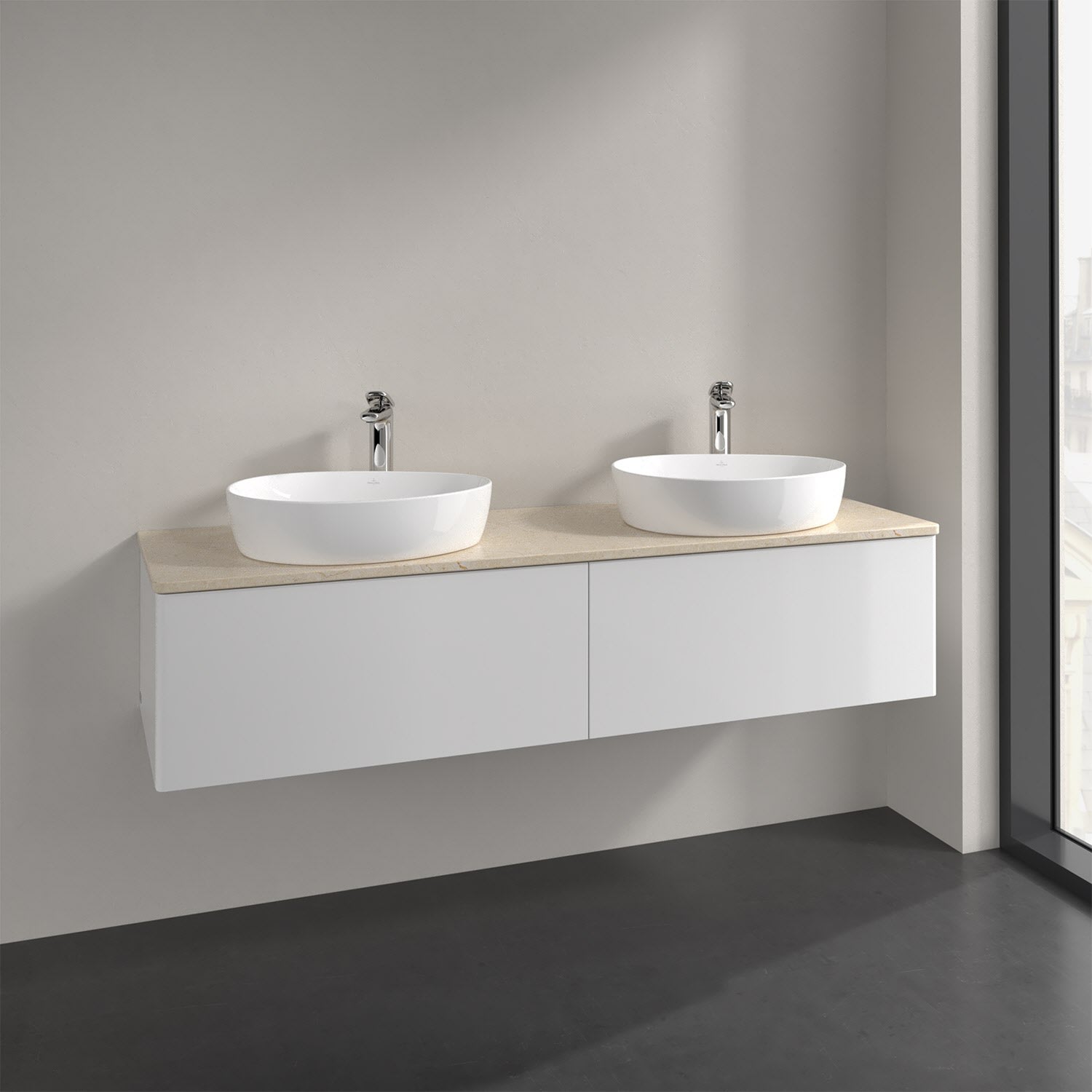 Der wandhängende Antao Waschtischunterschrank für zwei Aufsatzwaschtische bietet mit seinen beiden extra hohen Auszügen und seiner erstaunlichen Größe viel Platz zum Verstauen von Utensilien im Badezimmer. Inspiriert von der Natur überzeugt der Unterschrank auch optisch mit sanfter Formsprache und abgerundete Kanten. Die grifflosen Auszüge sind mit der Push-to-Open Funktion ausgestattet und verfügen über einen Antirutschboden, damit Utensilien sicher verstaut werden können. Mit seiner Vollauszug- und Selbsteinzug-Funktion ist der Schrank praktisch und leicht zu bedienen. Qualität von Villeroy & Boch! Für eine besonders leichte Pflege sorgt die mehrschichtig deckend lackierte Oberfläche. Bei der Ausführung in Massivholz wird dank des verarbeiteten Massivholzes jedes Möbel zu einem Unikat, das sich durch das lebendige Naturmaterial durch seine einzigartige Struktur und Maserung auszeichnet.