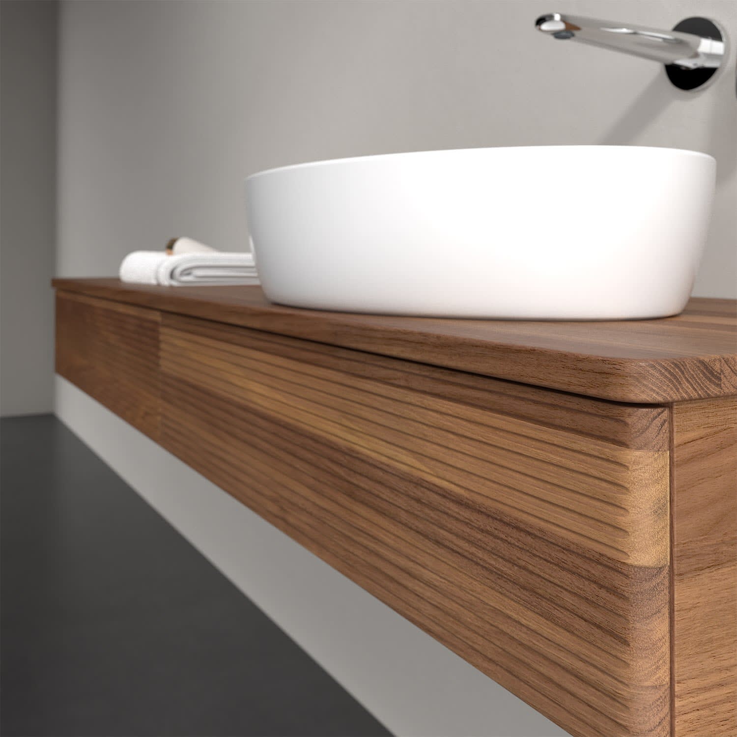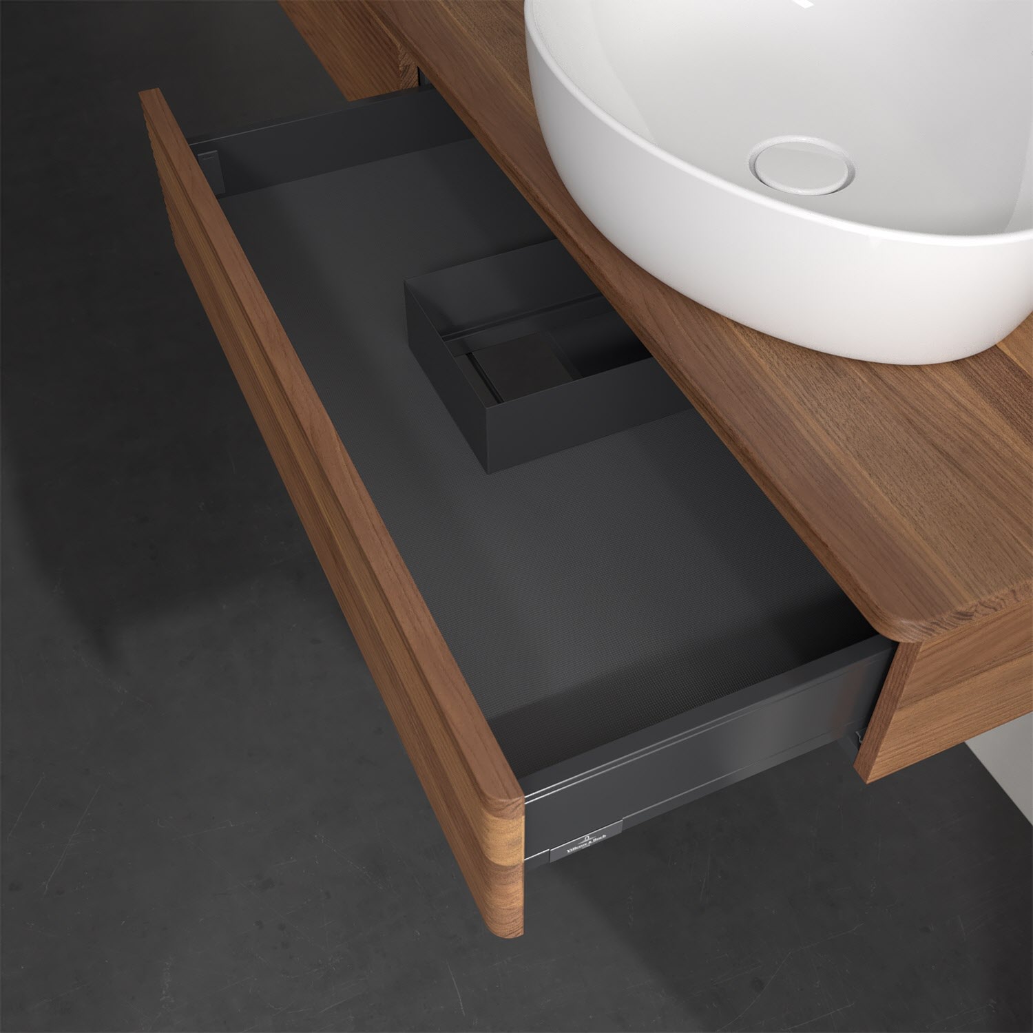 Der wandhängende Antao Waschtischunterschrank von Villeroy & Boch bietet nicht nur jede Menge Stauraum – er ist dank seines naturinspirierten Designs mit seinen abgerundeten Kanten auch noch besonders stilvoll und schafft eine gemütliche Atmosphäre im Badezimmer. Auf der Waschtischplatte bietet sich seitlich des Waschtischs viel Platz für Zahnbürstenbecher oder Seifenspender. Der geräumige Auszug bietet viel Platz, um alles Notwendige zu verstauen und Ordnung zu halten. Öffnen lässt er sich durch leichten Druck auf die strukturierte Front. Dank Vollauszug hat man immer alles im Blick und der Antirutschboden verhindert ein Umfallen oder Verrutschen der Gegenstände. Einfach clever! Für eine besonders leichte Pflege sorgt die mehrschichtig deckend lackierte Oberfläche. Bei der Ausführung in Massivholz wird dank des verarbeiteten Massivholzes jedes Möbel zu einem Unikat, das sich durch das lebendige Naturmaterial durch seine einzigartige Struktur und Maserung auszeichnet.