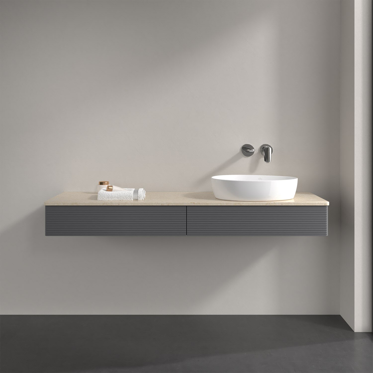 Villeroy & Boch Antao Waschbeckenunterschrank, 160 x 19 cm, 2 Auszüge, Front mit Struktur, ohne Hahnloch, für Waschtisch rechts
