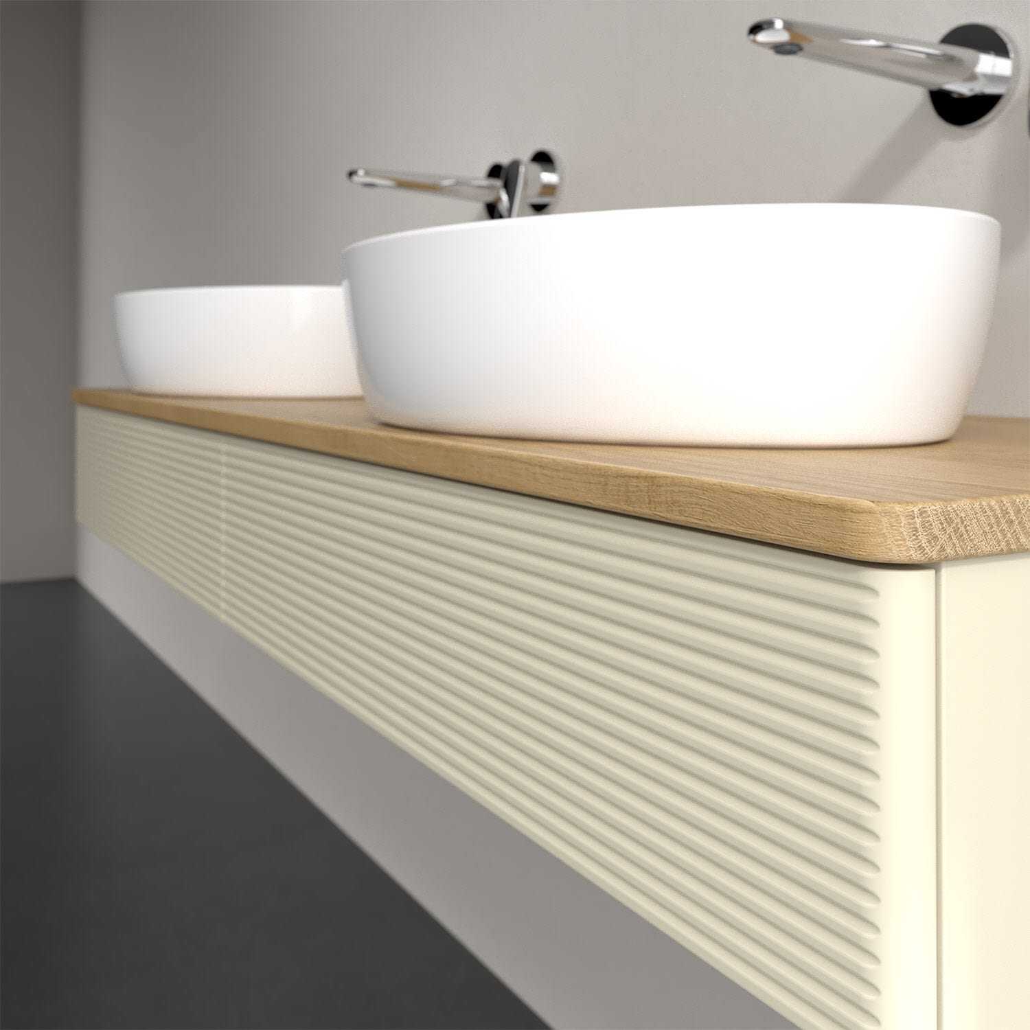 Der wandhängende Antao Waschtischunterschrank von Villeroy & Boch bietet nicht nur jede Menge Stauraum – er ist dank seines naturinspirierten Designs mit seinen abgerundeten Kanten auch noch besonders stilvoll und schafft eine gemütliche Atmosphäre im Badezimmer. Kombiniert mit zwei passenden Aufsatzwaschtischen also die ideale Wahl. Der geräumige Auszug bietet viel Platz, um alles Notwendige zu verstauen und Ordnung zu halten. Öffnen lässt er sich durch leichten Druck auf die strukturierte Front. Dank Vollauszug hat man immer alles im Blick und der Antirutschboden verhindert ein Umfallen oder Verrutschen der Gegenstände. Einfach clever! Für eine besonders leichte Pflege sorgt die mehrschichtig deckend lackierte Oberfläche. Bei der Ausführung in Massivholz wird dank des verarbeiteten Massivholzes jedes Möbel zu einem Unikat, das sich durch das lebendige Naturmaterial durch seine einzigartige Struktur und Maserung auszeichnet.