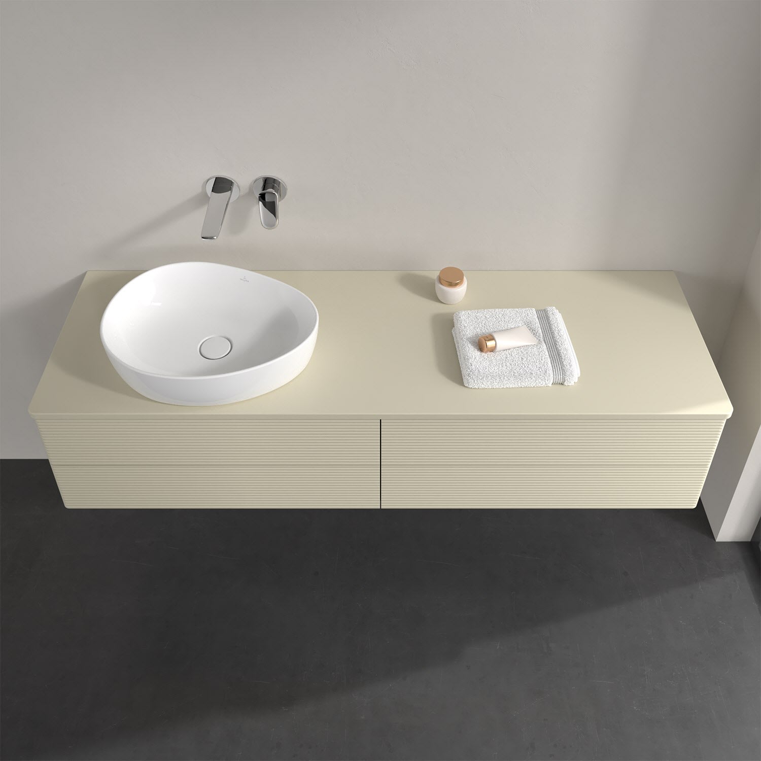 Für diesen Waschbeckenunterschrank stehen Ihnen Aufsatzwaschtische aus verschiedenen Serien zur Verfügung (siehe "Passliste" unter Downloads). Ein ausgewähltes Beispiel finden Sie im Zubehör. Den Waschtisch bitte separat mitbestellen.