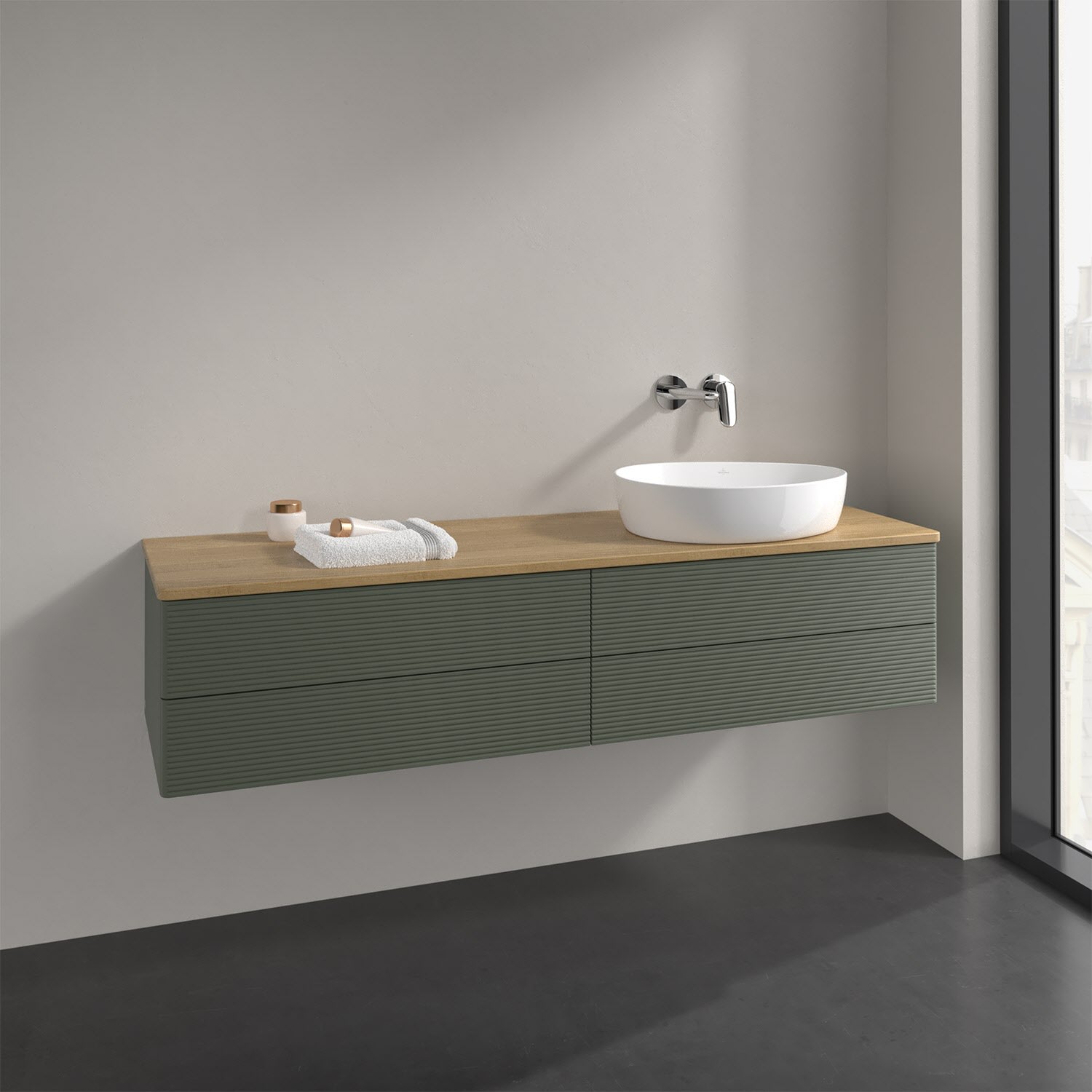 Der wandhängende Antao Waschtischunterschrank bietet mit seinen vier Auszügen und seiner erstaunlichen Größe viel Platz zum Verstauen von Utensilien im Badezimmer. Dank des seitlich platzierten Aufsatzwaschtischs gibt es daneben weiteren Platz für Handtücher, Seifenspender & Co. auf der Waschtischplatte. Inspiriert von der Natur überzeugt der Unterschrank auch optisch mit sanfter Formsprache und abgerundete Kanten. Die grifflosen Auszüge mit strukturierter Front sind mit der Push-to-Open Funktion ausgestattet und verfügen über einen Antirutschboden, damit Utensilien sicher verstaut werden können. Mit seiner Vollauszug- und Selbsteinzug-Funktion ist der Schrank praktisch und leicht zu bedienen. Qualität von Villeroy & Boch! Für eine besonders leichte Pflege sorgt die mehrschichtig deckend lackierte Oberfläche. Bei der Ausführung in Massivholz wird dank des verarbeiteten Massivholzes jedes Möbel zu einem Unikat, das sich durch das lebendige Naturmaterial durch seine einzigartige Struktur und Maserung auszeichnet.