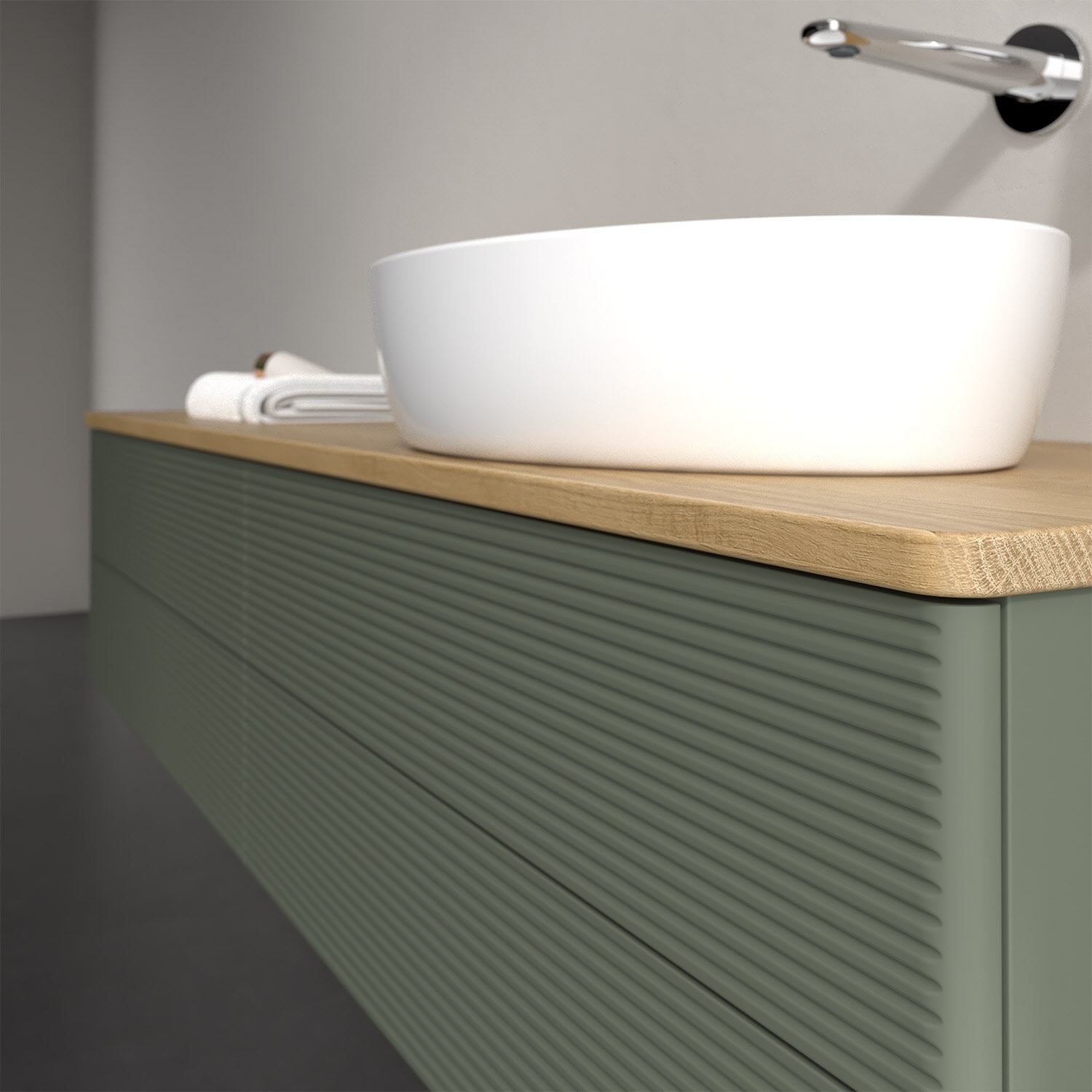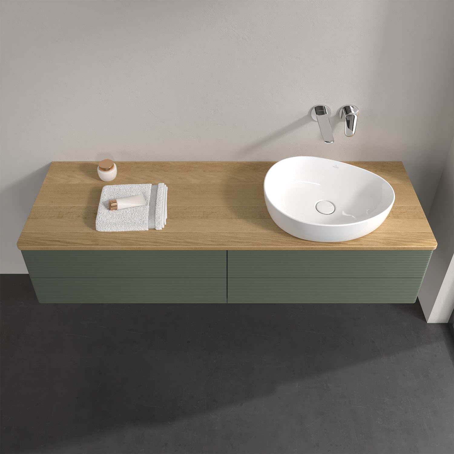 Für diesen Waschbeckenunterschrank stehen Ihnen Aufsatzwaschtische aus verschiedenen Serien zur Verfügung (siehe "Passliste" unter Downloads). Ein ausgewähltes Beispiel finden Sie im Zubehör. Den Waschtisch bitte separat mitbestellen.