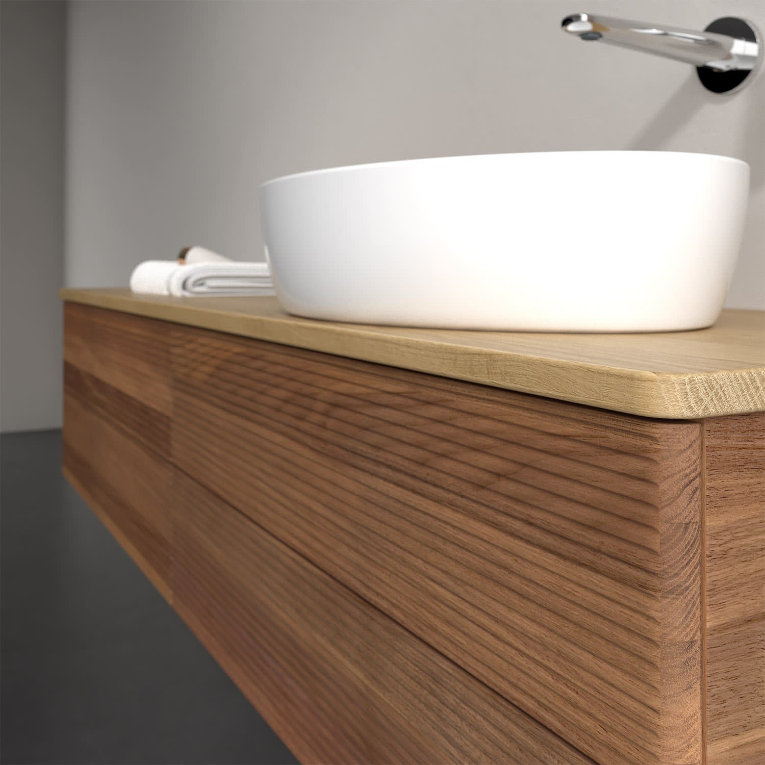 Der wandhängende Antao Waschtischunterschrank bietet mit seinen vier Auszügen und seiner erstaunlichen Größe viel Platz zum Verstauen von Utensilien im Badezimmer. Dank des seitlich platzierten Aufsatzwaschtischs gibt es daneben weiteren Platz für Handtücher, Seifenspender & Co. auf der Waschtischplatte. Inspiriert von der Natur überzeugt der Unterschrank auch optisch mit sanfter Formsprache und abgerundete Kanten. Die grifflosen Auszüge mit strukturierter Front sind mit der Push-to-Open Funktion ausgestattet und verfügen über einen Antirutschboden, damit Utensilien sicher verstaut werden können. Mit seiner Vollauszug- und Selbsteinzug-Funktion ist der Schrank praktisch und leicht zu bedienen. Qualität von Villeroy & Boch! Für eine besonders leichte Pflege sorgt die mehrschichtig deckend lackierte Oberfläche. Bei der Ausführung in Massivholz wird dank des verarbeiteten Massivholzes jedes Möbel zu einem Unikat, das sich durch das lebendige Naturmaterial durch seine einzigartige Struktur und Maserung auszeichnet.