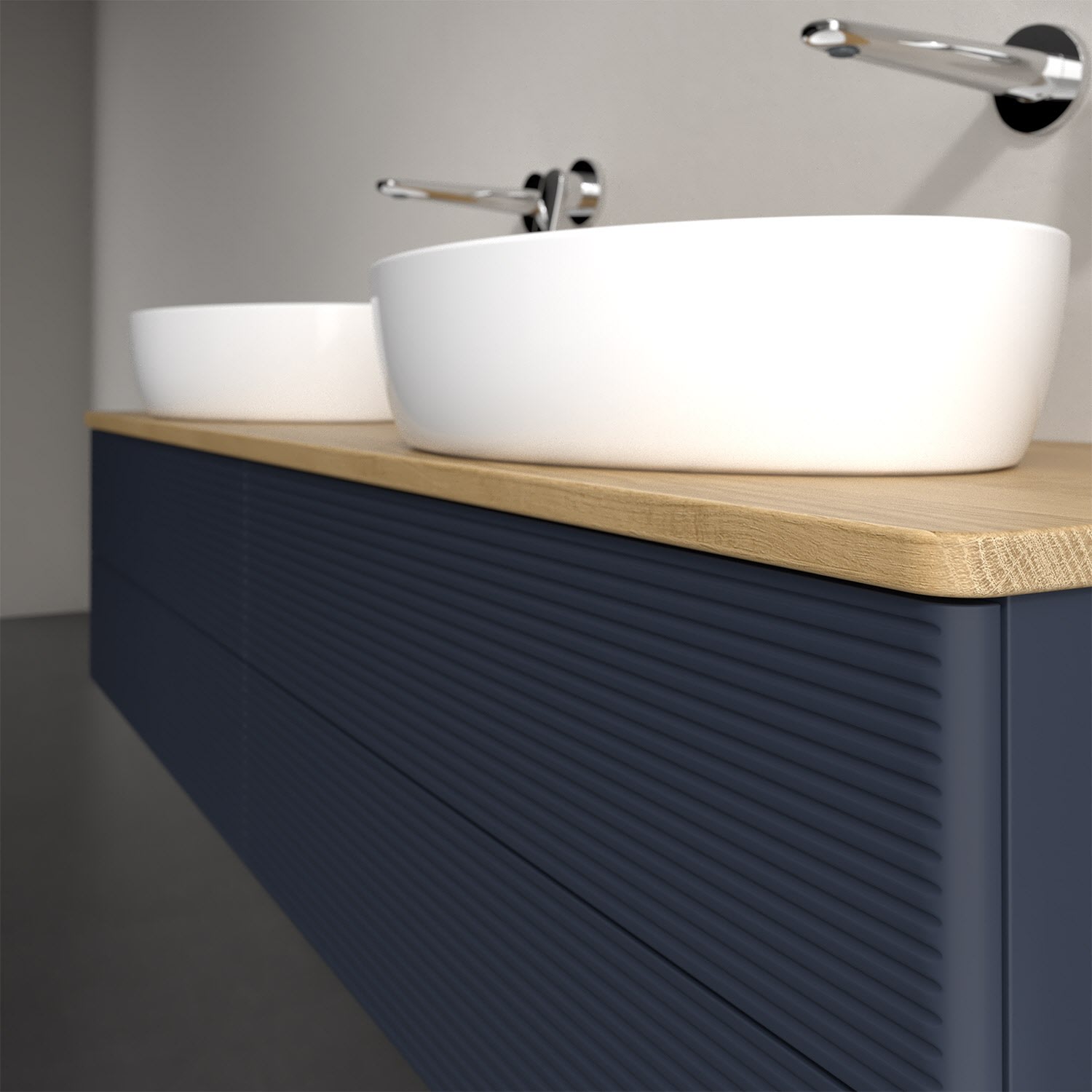 Der wandhängende Antao Waschtischunterschrank für zwei Aufsatzwaschtische bietet mit seinen vier Auszügen und seiner erstaunlichen Größe viel Platz zum Verstauen von Utensilien im Badezimmer. Inspiriert von der Natur überzeugt der Unterschrank auch optisch mit sanfter Formsprache und abgerundete Kanten. Die grifflosen Auszüge mit strukturierter Front sind mit der Push-to-Open Funktion ausgestattet und verfügen über einen Antirutschboden, damit Utensilien sicher verstaut werden können. Mit seiner Vollauszug- und Selbsteinzug-Funktion ist der Schrank praktisch und leicht zu bedienen. Qualität von Villeroy & Boch! Für eine besonders leichte Pflege sorgt die mehrschichtig deckend lackierte Oberfläche. Bei der Ausführung in Massivholz wird dank des verarbeiteten Massivholzes jedes Möbel zu einem Unikat, das sich durch das lebendige Naturmaterial durch seine einzigartige Struktur und Maserung auszeichnet.