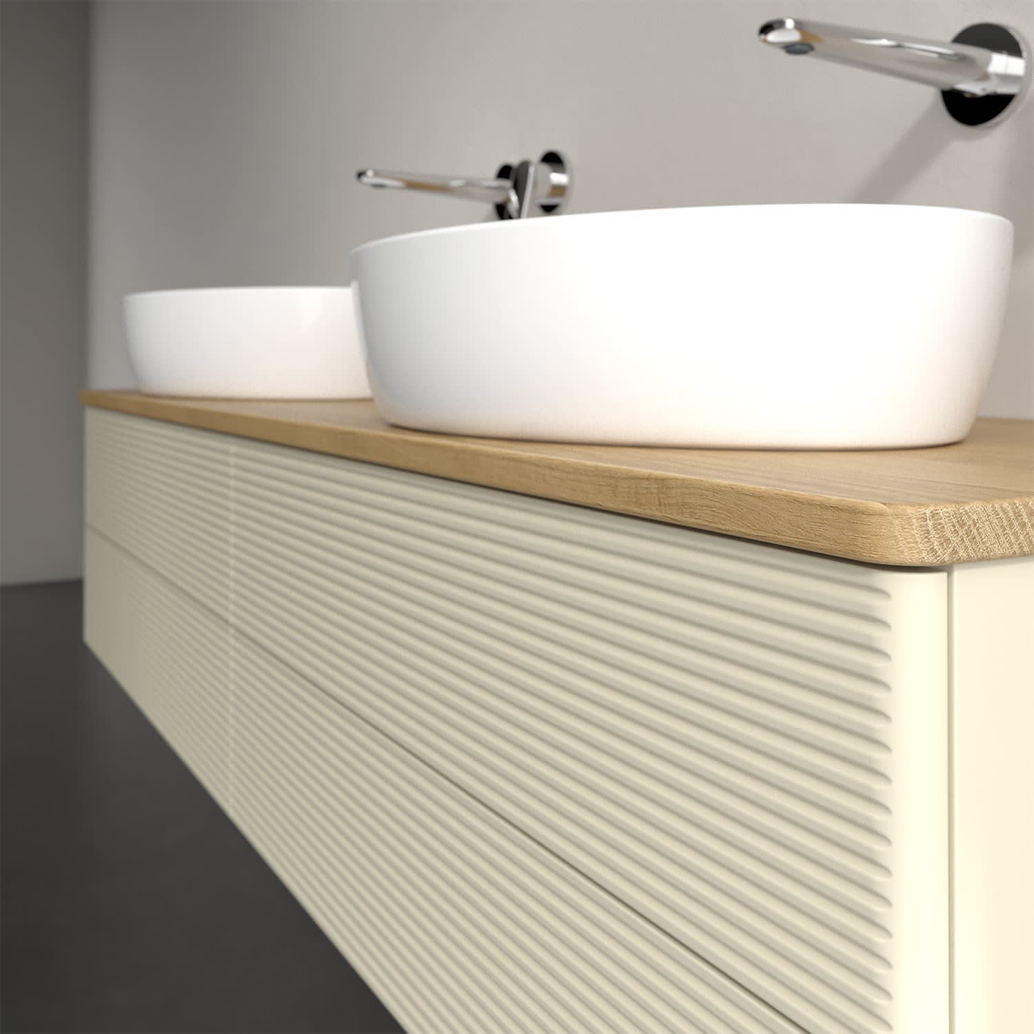 Der wandhängende Antao Waschtischunterschrank für zwei Aufsatzwaschtische bietet mit seinen vier Auszügen und seiner erstaunlichen Größe viel Platz zum Verstauen von Utensilien im Badezimmer. Inspiriert von der Natur überzeugt der Unterschrank auch optisch mit sanfter Formsprache und abgerundete Kanten. Die grifflosen Auszüge mit strukturierter Front sind mit der Push-to-Open Funktion ausgestattet und verfügen über einen Antirutschboden, damit Utensilien sicher verstaut werden können. Mit seiner Vollauszug- und Selbsteinzug-Funktion ist der Schrank praktisch und leicht zu bedienen. Qualität von Villeroy & Boch! Für eine besonders leichte Pflege sorgt die mehrschichtig deckend lackierte Oberfläche. Bei der Ausführung in Massivholz wird dank des verarbeiteten Massivholzes jedes Möbel zu einem Unikat, das sich durch das lebendige Naturmaterial durch seine einzigartige Struktur und Maserung auszeichnet.