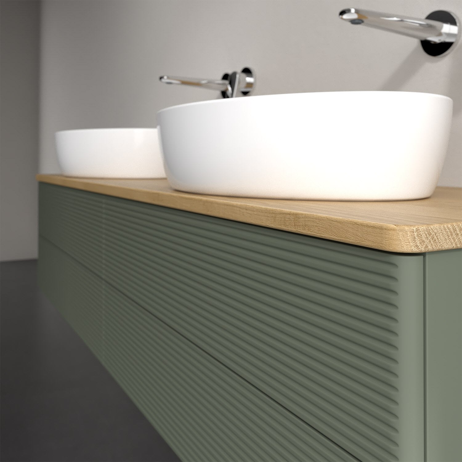 Der wandhängende Antao Waschtischunterschrank für zwei Aufsatzwaschtische bietet mit seinen vier Auszügen und seiner erstaunlichen Größe viel Platz zum Verstauen von Utensilien im Badezimmer. Inspiriert von der Natur überzeugt der Unterschrank auch optisch mit sanfter Formsprache und abgerundete Kanten. Die grifflosen Auszüge mit strukturierter Front sind mit der Push-to-Open Funktion ausgestattet und verfügen über einen Antirutschboden, damit Utensilien sicher verstaut werden können. Mit seiner Vollauszug- und Selbsteinzug-Funktion ist der Schrank praktisch und leicht zu bedienen. Qualität von Villeroy & Boch! Für eine besonders leichte Pflege sorgt die mehrschichtig deckend lackierte Oberfläche. Bei der Ausführung in Massivholz wird dank des verarbeiteten Massivholzes jedes Möbel zu einem Unikat, das sich durch das lebendige Naturmaterial durch seine einzigartige Struktur und Maserung auszeichnet.