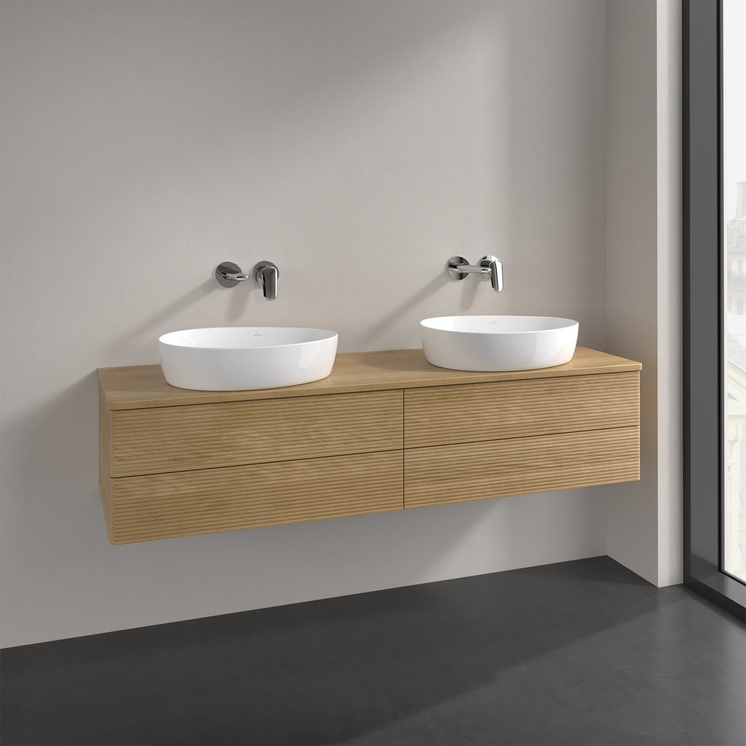 Der wandhängende Antao Waschtischunterschrank für zwei Aufsatzwaschtische bietet mit seinen vier Auszügen und seiner erstaunlichen Größe viel Platz zum Verstauen von Utensilien im Badezimmer. Inspiriert von der Natur überzeugt der Unterschrank auch optisch mit sanfter Formsprache und abgerundete Kanten. Die grifflosen Auszüge mit strukturierter Front sind mit der Push-to-Open Funktion ausgestattet und verfügen über einen Antirutschboden, damit Utensilien sicher verstaut werden können. Mit seiner Vollauszug- und Selbsteinzug-Funktion ist der Schrank praktisch und leicht zu bedienen. Qualität von Villeroy & Boch! Für eine besonders leichte Pflege sorgt die mehrschichtig deckend lackierte Oberfläche. Bei der Ausführung in Massivholz wird dank des verarbeiteten Massivholzes jedes Möbel zu einem Unikat, das sich durch das lebendige Naturmaterial durch seine einzigartige Struktur und Maserung auszeichnet.