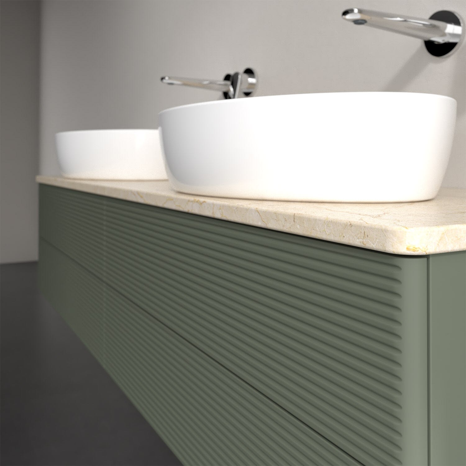 Der wandhängende Antao Waschtischunterschrank für zwei Aufsatzwaschtische bietet mit seinen vier Auszügen und seiner erstaunlichen Größe viel Platz zum Verstauen von Utensilien im Badezimmer. Inspiriert von der Natur überzeugt der Unterschrank auch optisch mit sanfter Formsprache und abgerundete Kanten. Die grifflosen Auszüge mit strukturierter Front sind mit der Push-to-Open Funktion ausgestattet und verfügen über einen Antirutschboden, damit Utensilien sicher verstaut werden können. Mit seiner Vollauszug- und Selbsteinzug-Funktion ist der Schrank praktisch und leicht zu bedienen. Qualität von Villeroy & Boch! Für eine besonders leichte Pflege sorgt die mehrschichtig deckend lackierte Oberfläche. Bei der Ausführung in Massivholz wird dank des verarbeiteten Massivholzes jedes Möbel zu einem Unikat, das sich durch das lebendige Naturmaterial durch seine einzigartige Struktur und Maserung auszeichnet.