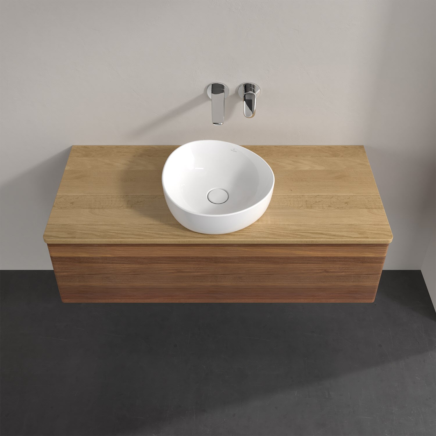 Der wandhängende Antao Waschtischunterschrank von Villeroy & Boch bietet nicht nur jede Menge Stauraum – er ist dank seines naturinspirierten Designs mit seinen abgerundeten Kanten auch noch besonders stilvoll und schafft eine gemütliche Atmosphäre im Badezimmer. Auf der Waschtischplatte bietet sich rechts und links neben dem Waschtisch viel Platz für Zahnbürstenbecher oder Seifenspender. Ein extra hoher Auszug bietet viel Platz, um alles Notwendige zu verstauen und Ordnung zu halten. Öffnen lässt er sich durch leichten Druck auf die strukturierte Front. Dank Vollauszug hat man immer alles im Blick und der Antirutschboden verhindert ein Umfallen oder Verrutschen der Gegenstände. Einfach clever! Für eine besonders leichte Pflege sorgt die mehrschichtig deckend lackierte Oberfläche. Bei der Ausführung in Massivholz wird dank des verarbeiteten Massivholzes jedes Möbel zu einem Unikat, das sich durch das lebendige Naturmaterial durch seine einzigartige Struktur und Maserung auszeichnet.